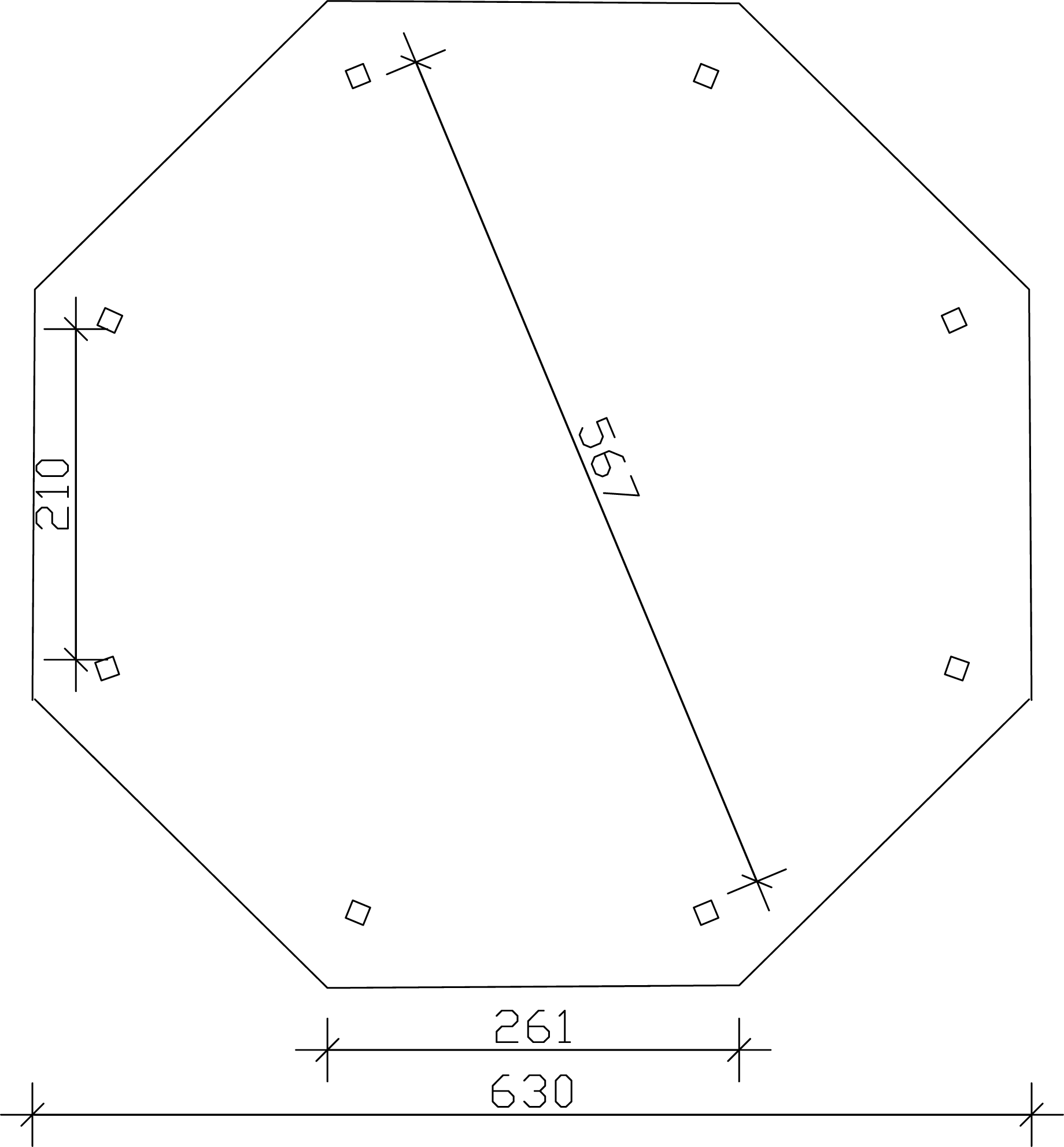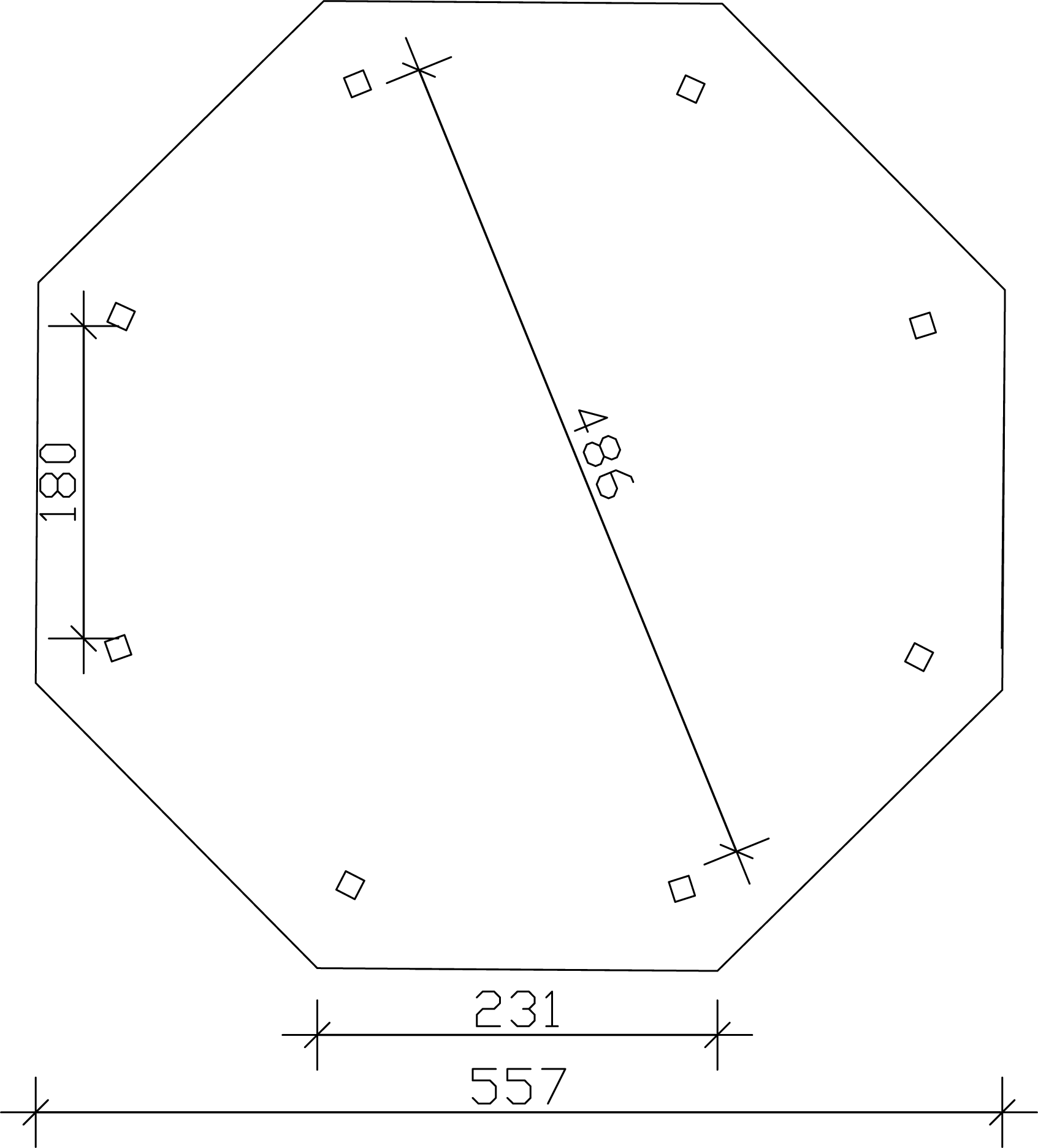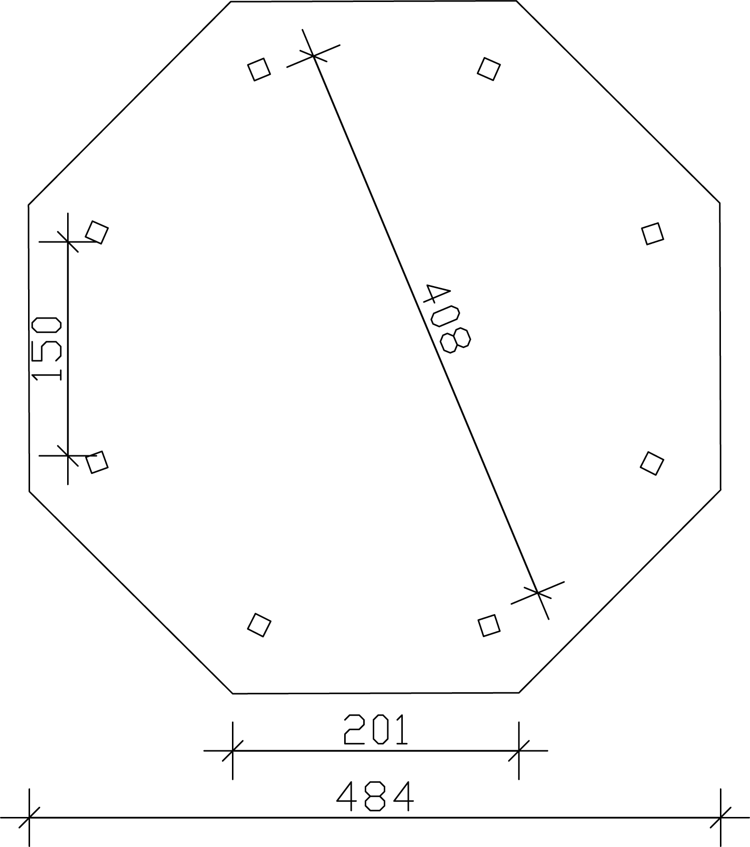 - Durchmesser des fertigen achteckigen Gartenpavillons mit Dachverlängerung, je nach Größe des gewählten Salons 484 cm; 557 cm ; 630 cm