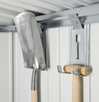 - Die Trapezblechtür des Eco-Gartenhauses ist nicht mit einem Gasfederscharnier versehen, sondern kann mit einem Haken geöffnet werden!