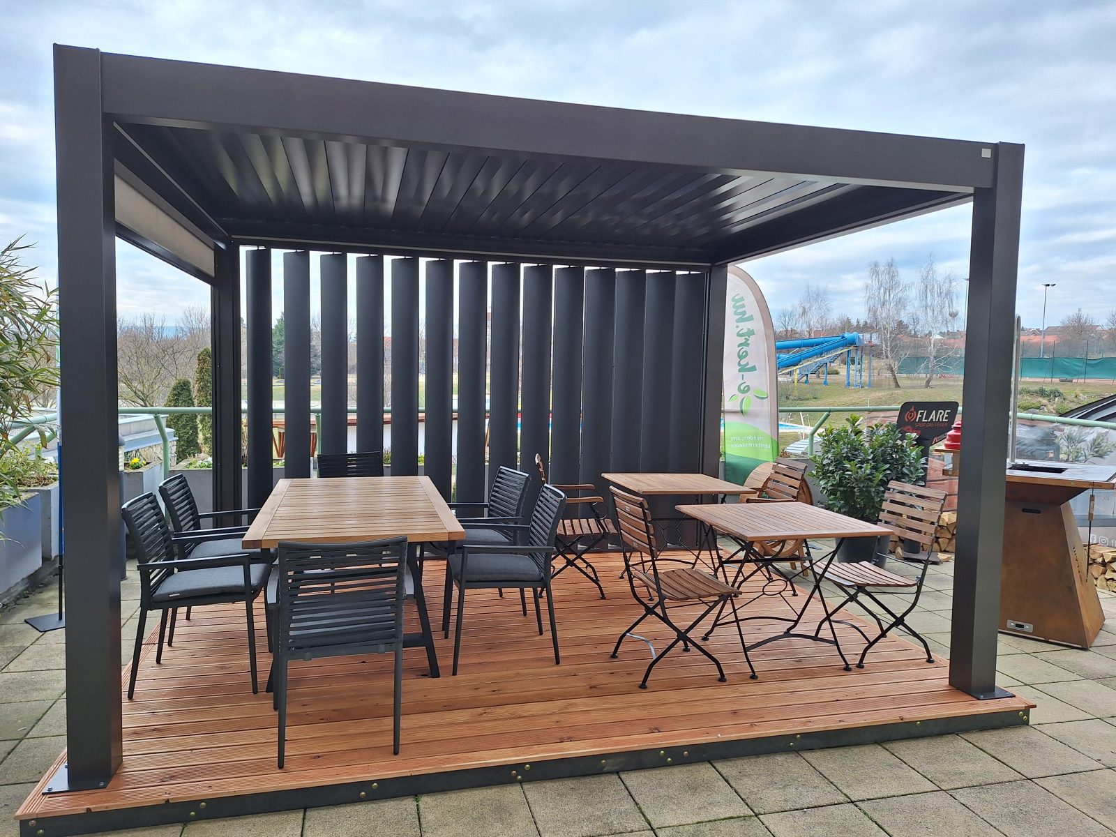 - Pulverbeschichteter anthrazitgrauer Rahmen + wetterfester Hartholzsitz + Hartholztischplatte. Witterungsbeständig, leicht und schnell zu reinigen.