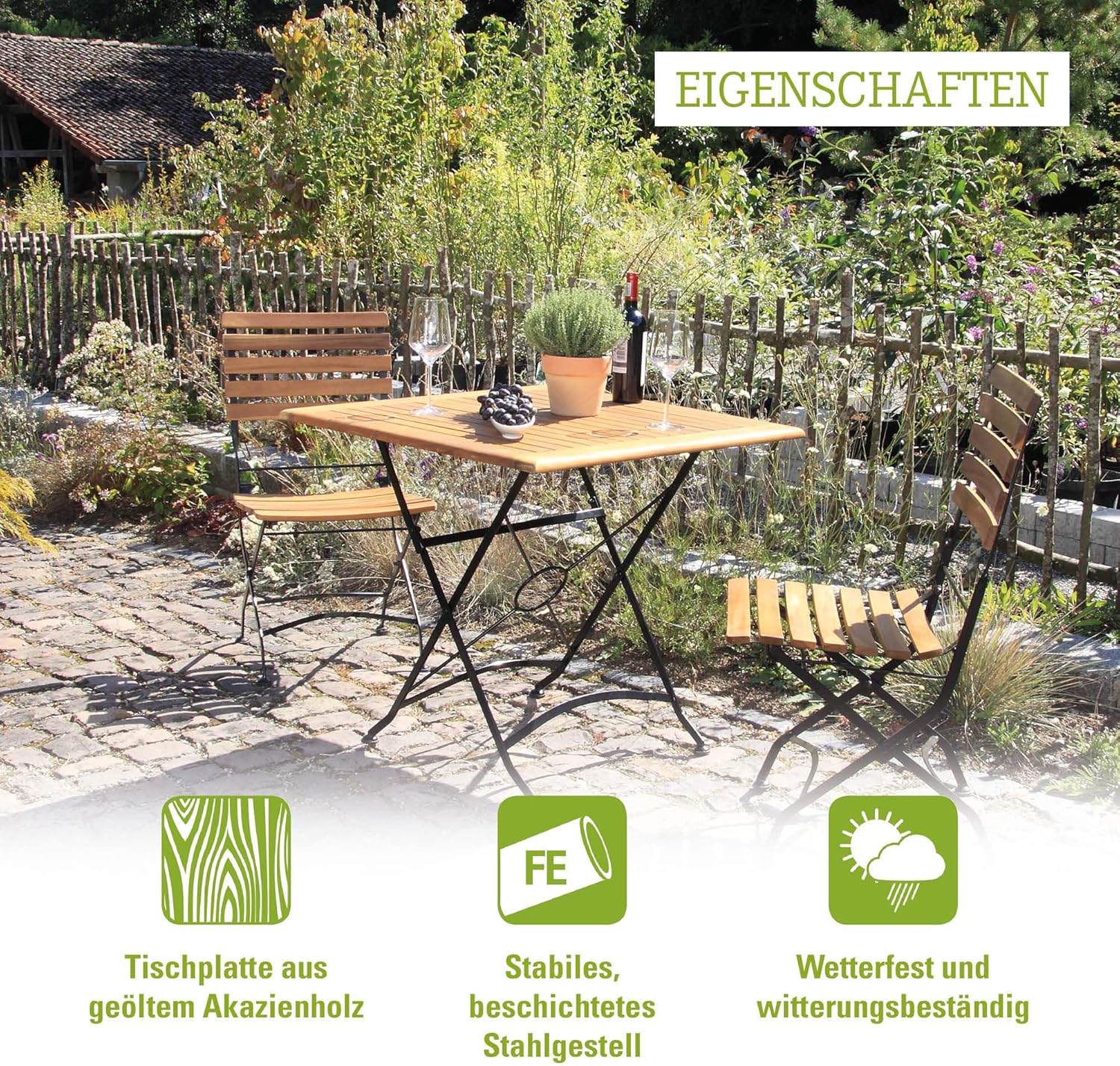 - Gartentisch aus Metall 80 x 80 cm; wetterfestes Gartenmöbelset aus Akazie mit Stahlrahmen.