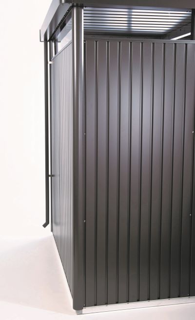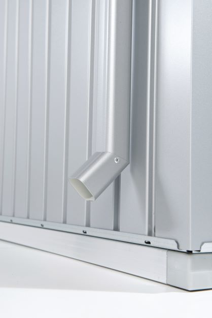 Das Biohort Rinnenset für die vertikale Regenentwässerung (zwei Rinnen in der Farbe des Hauses mit Auslauf und Befestigungsmaterial) ist optional in der gleichen Farbe wie das Haus erhältlich.