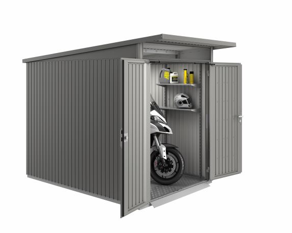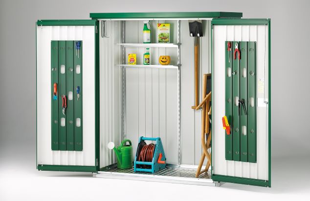 Alle notwendigen Beschläge und technischen Unterlagen, Montagezeichnungen sind in der Verpackung enthalten. Praktische Biohort-Lagerungslösungen für Gartenhäuser aus Metall.