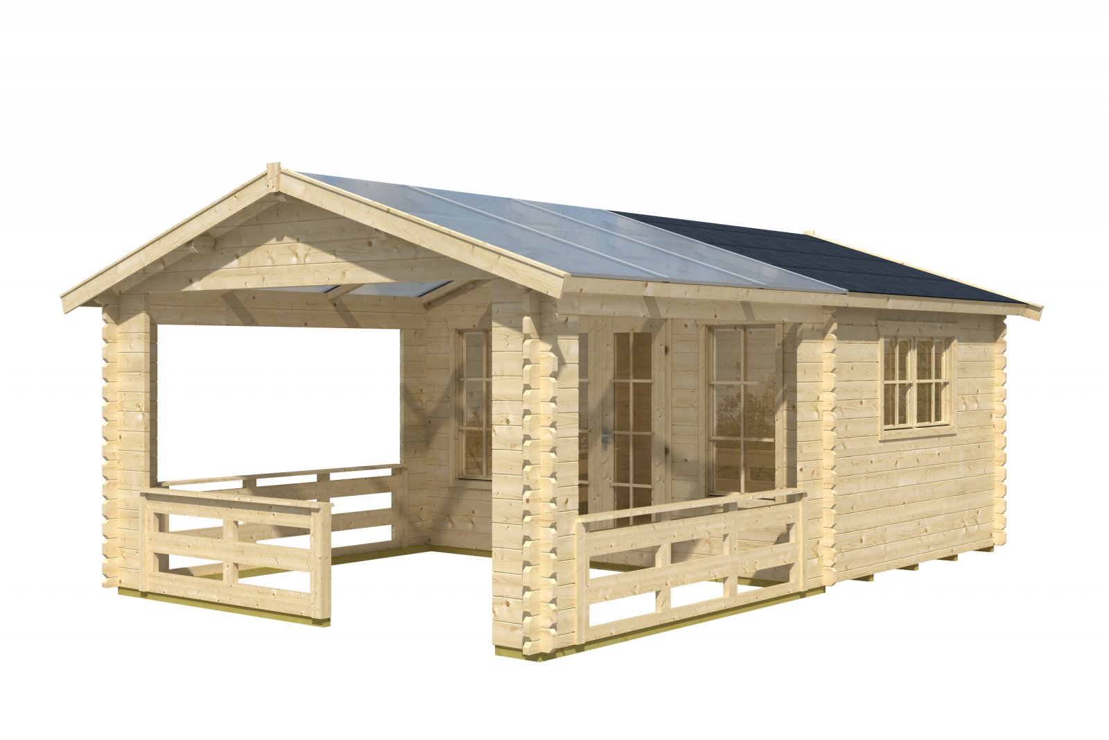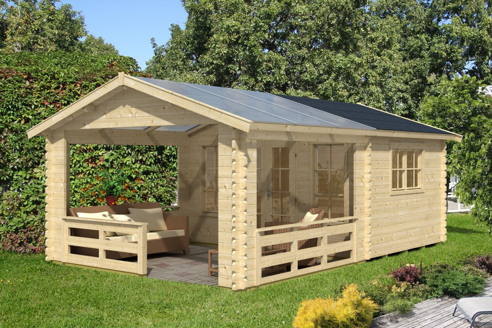 - Premium 45 mm Balkenhaus 380 x 300 cm + 310 cm Terrasse mit Polycarbonat-Terrassendach, natürliches, unbehandeltes Holz