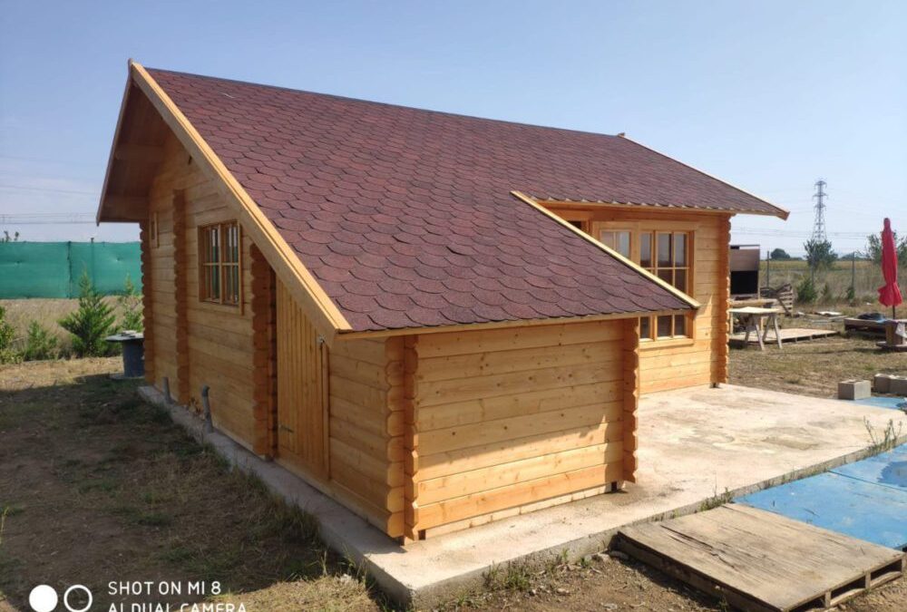 - 45 mm dickes, mit Fugen versehenes Vollbalkenmauerwerk, Boden- und Dachverkleidung 19 mm dick