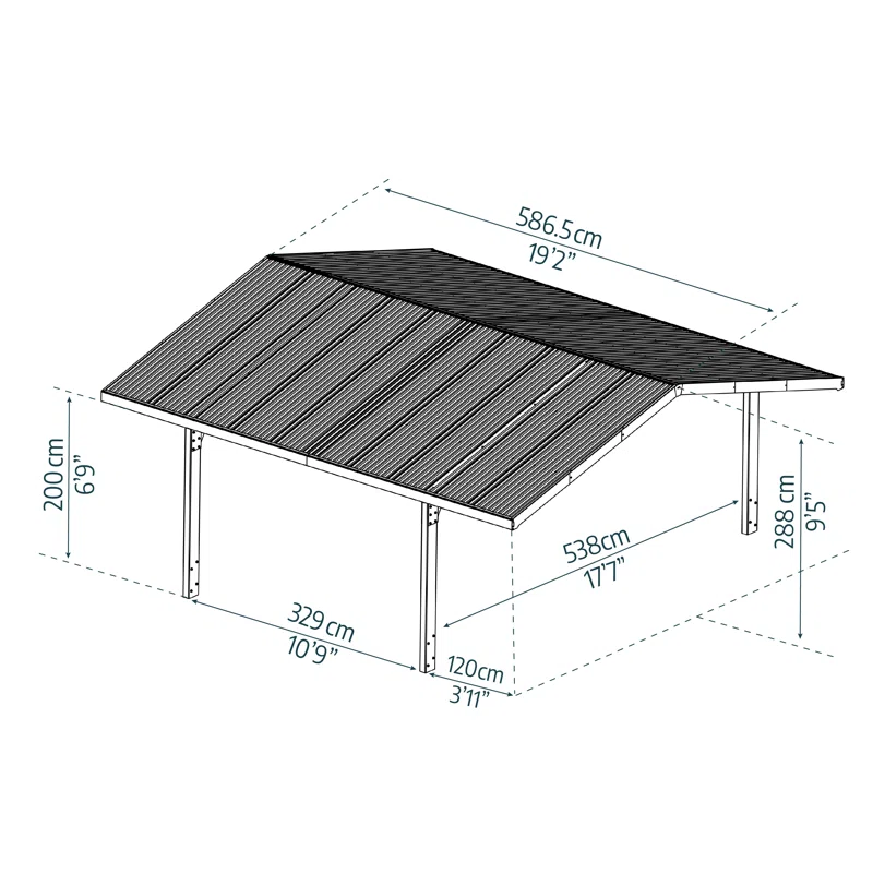 - Gesamtgröße des Garagendach-Carports 572 x 586 cm; Höhe des Garagendachs 288 cm