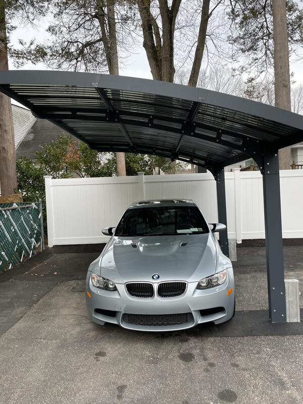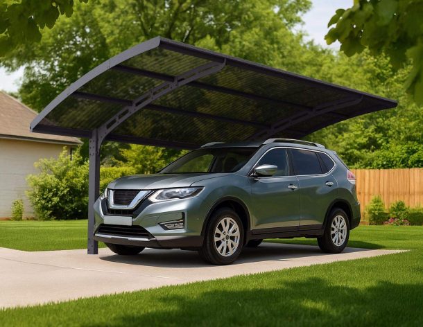 - Platzsparender, luftiger Carport, der von zwei Säulen gestützt wird und das Parken erleichtert