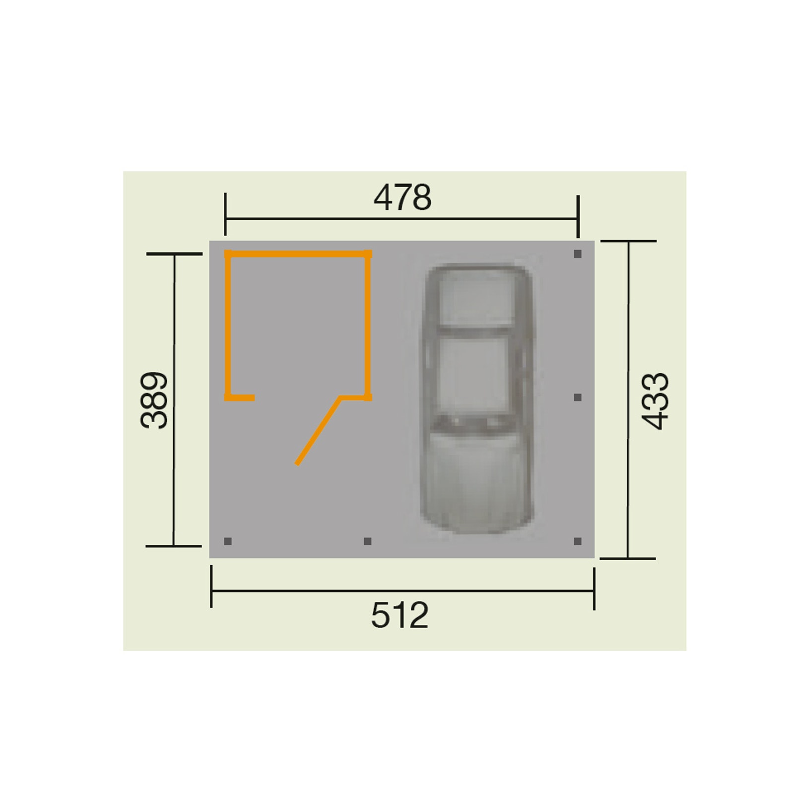 Offene Garage mit Fertigcarport und Geräteschuppen 512 x 433 cm
