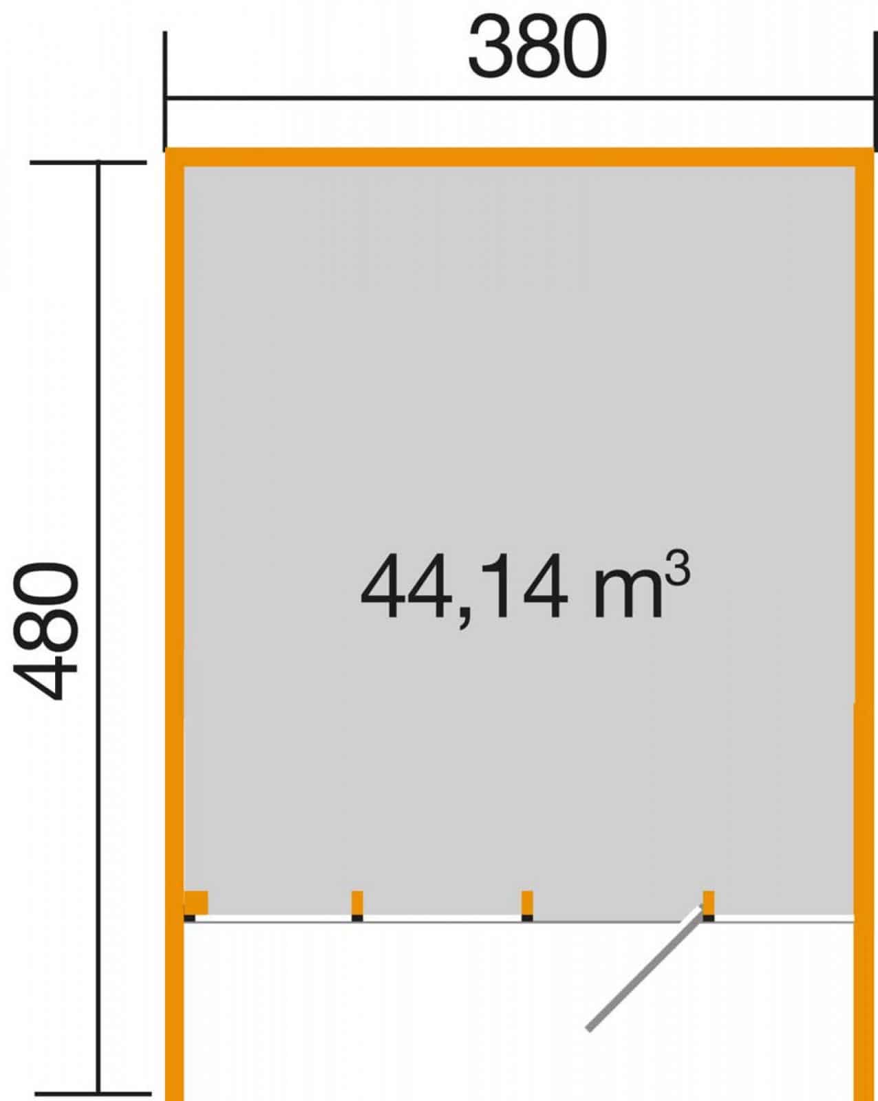 - Bruttogeschossfläche des Chalets 380 x 273 cm + 107 cm Vordach oder 380 x 355 cm + 107 cm Vordach, je nach gewählter Größe