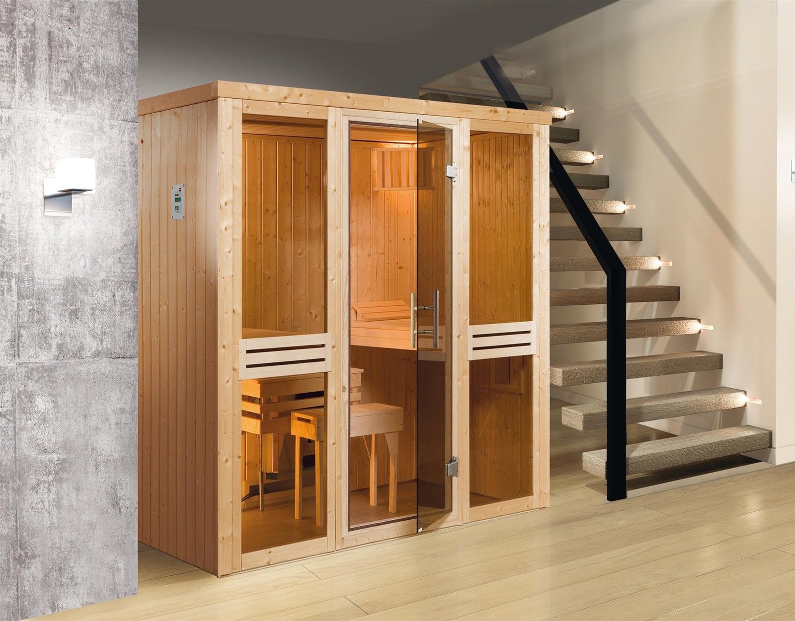 - 68 mm starke, vorgefertigte Paneelsauna mit exklusiven Fensterelementen und Saunatür aus Glas