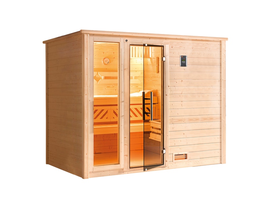 Finnische Sauna aus Massivholz mit 8 mm starker Teleglastür und dekorativem optionalem Fensterelement