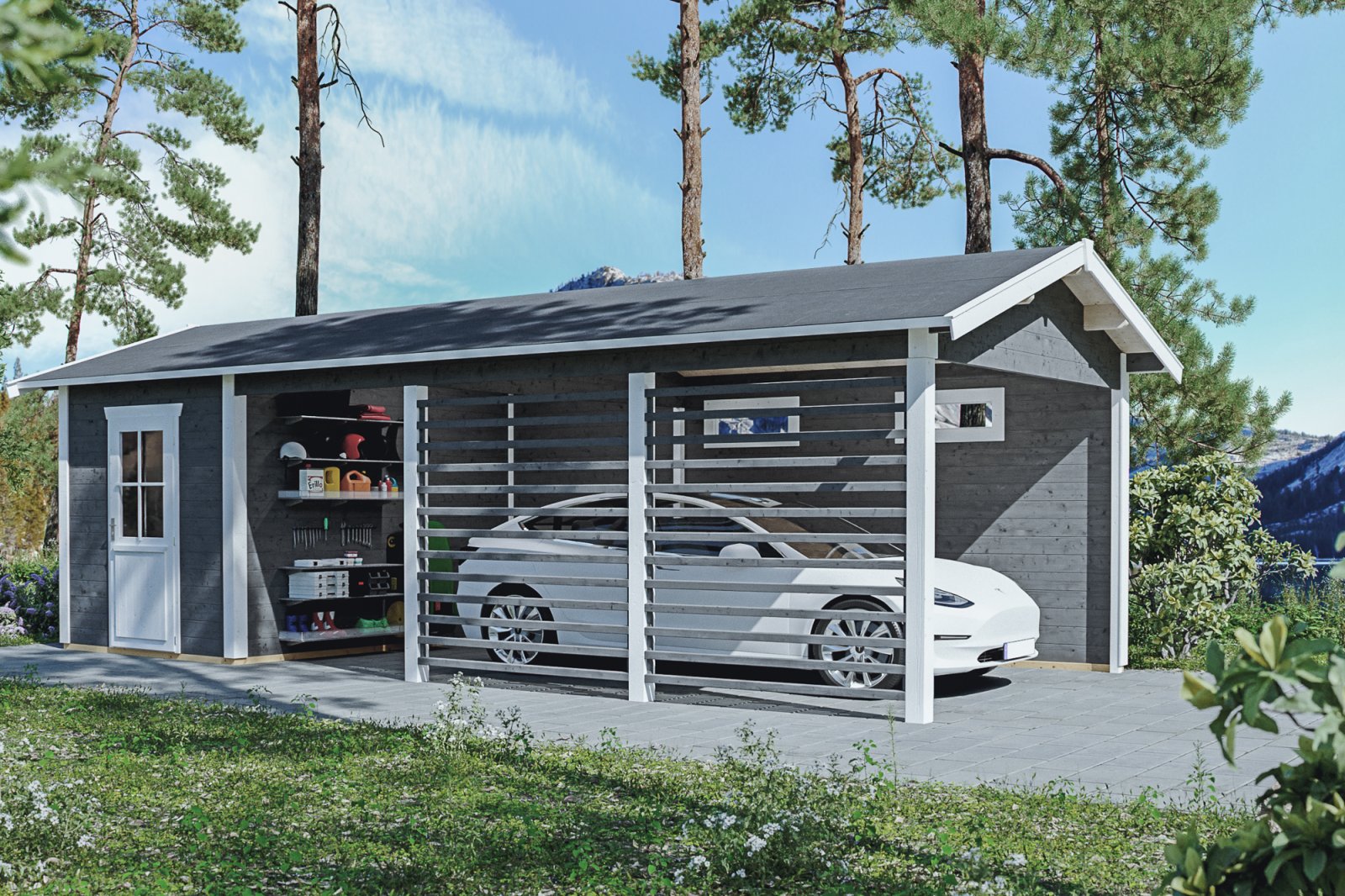 Garage mit Seitenwänden und Gerätehaus