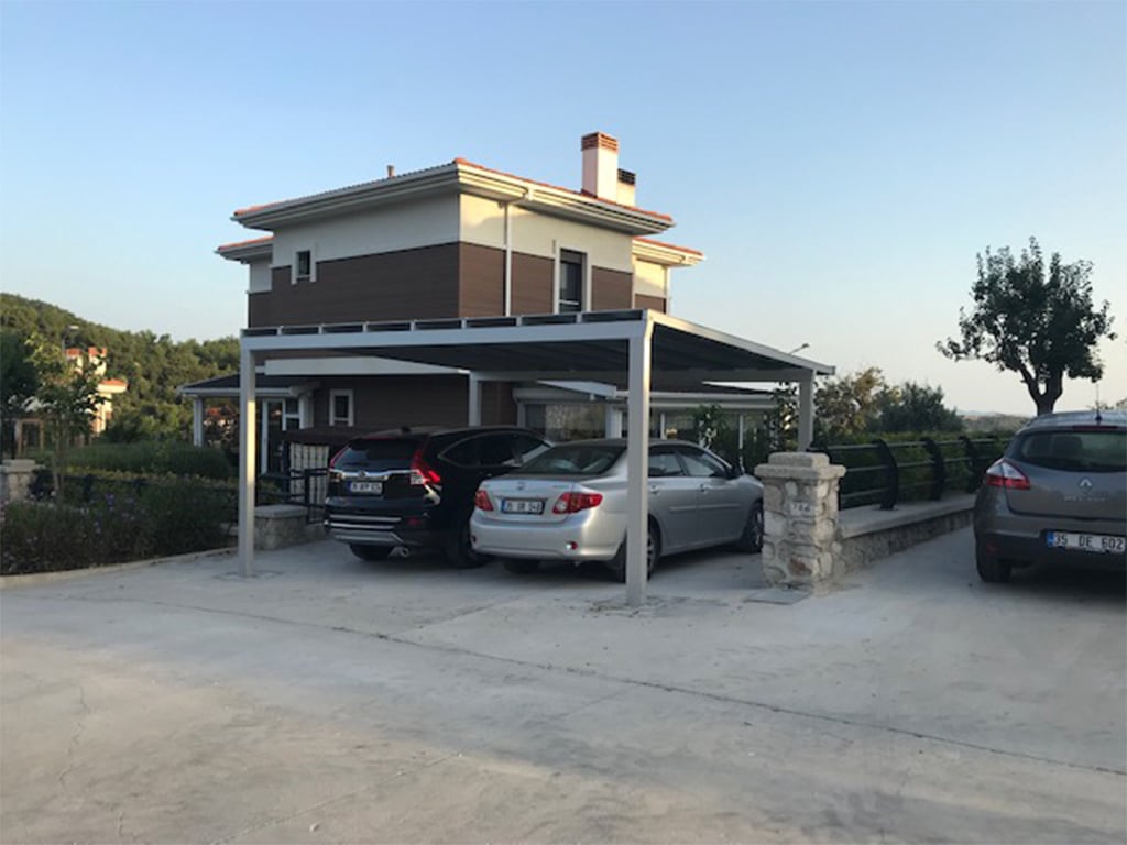 - Die tragende Struktur des zweistöckigen Garagendachs ist eine korrosionsbeständige Aluminiumstruktur. Die elegante, luftige Metallrahmenstruktur fügt sich gut in moderne Gebäudeumgebungen ein, auch in minimalistische Gebäude. Die Rahmenstruktur ist wartungsfrei und muss nie gestrichen werden.