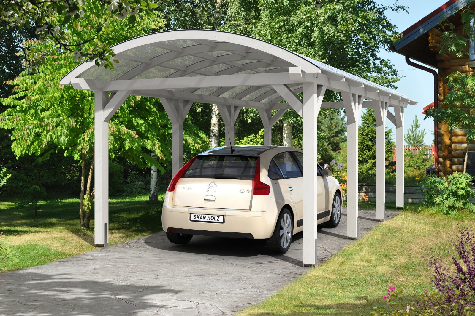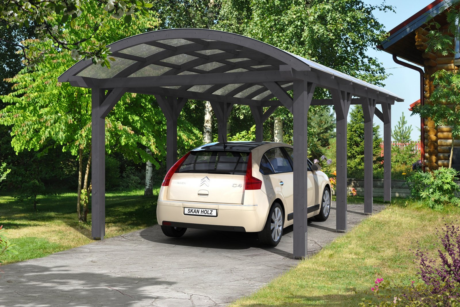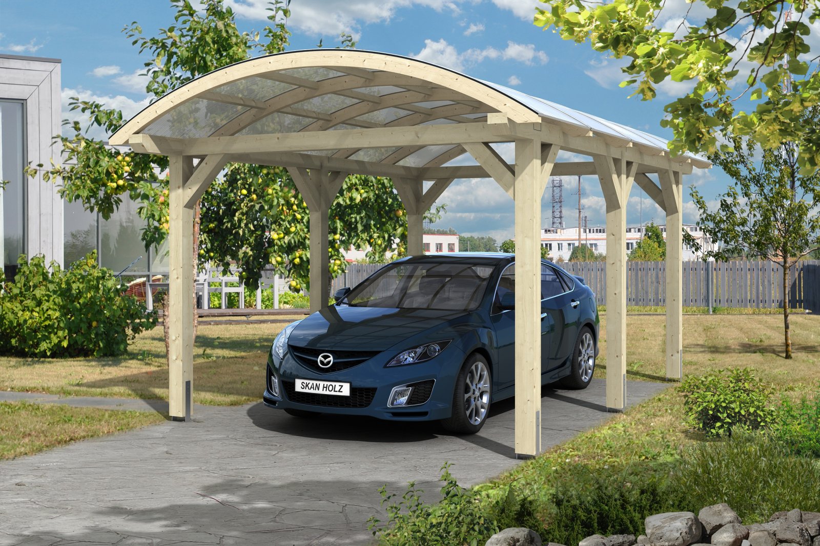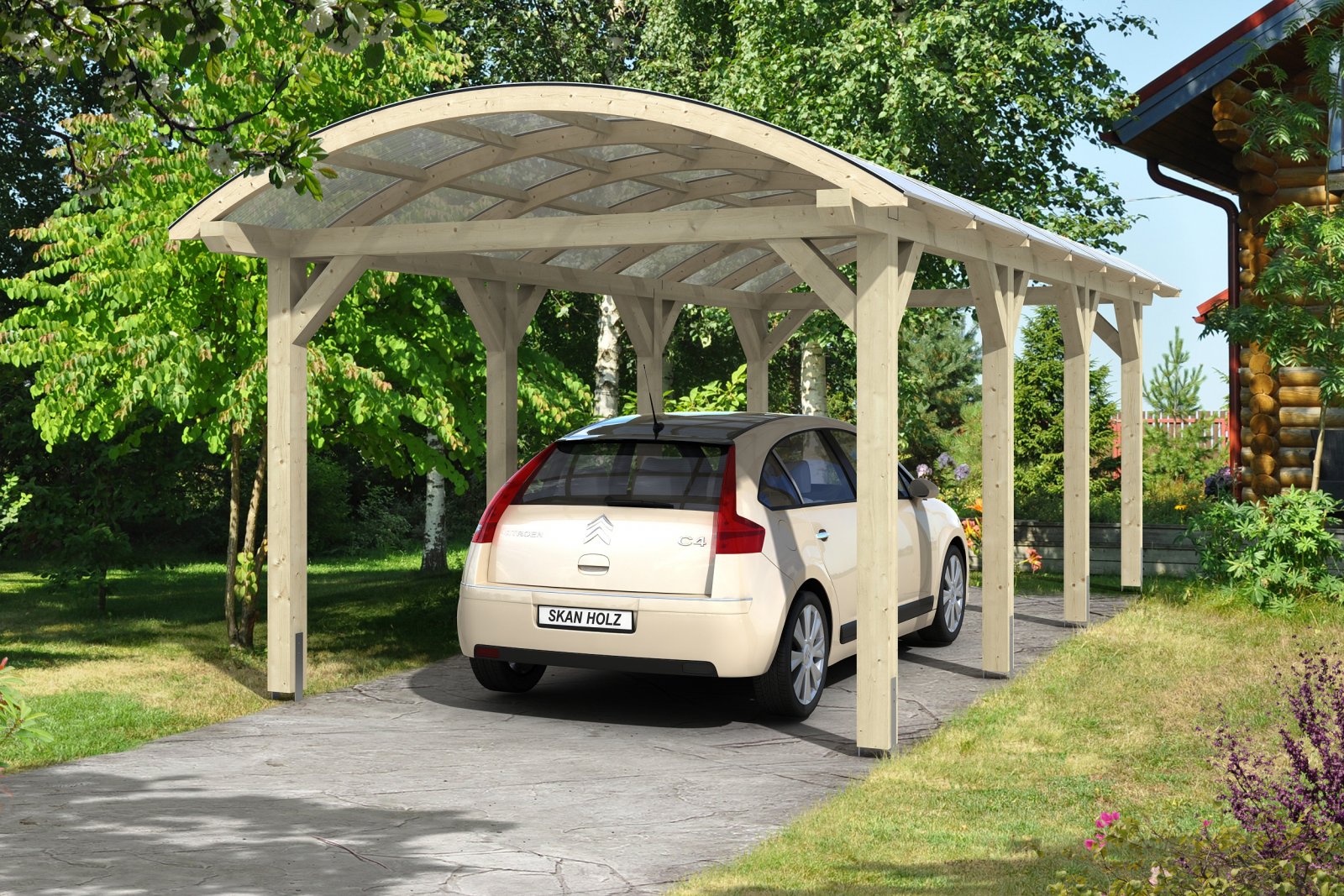 Garagendach / Pavillon in 2 verschiedenen Größen Typ Franken für ein Auto, elegante geschwungene Garagendachkonstruktion mit massiven 140 x 140 mm Säulenstützen , aus hochwertigem Leimholz gefertigt.