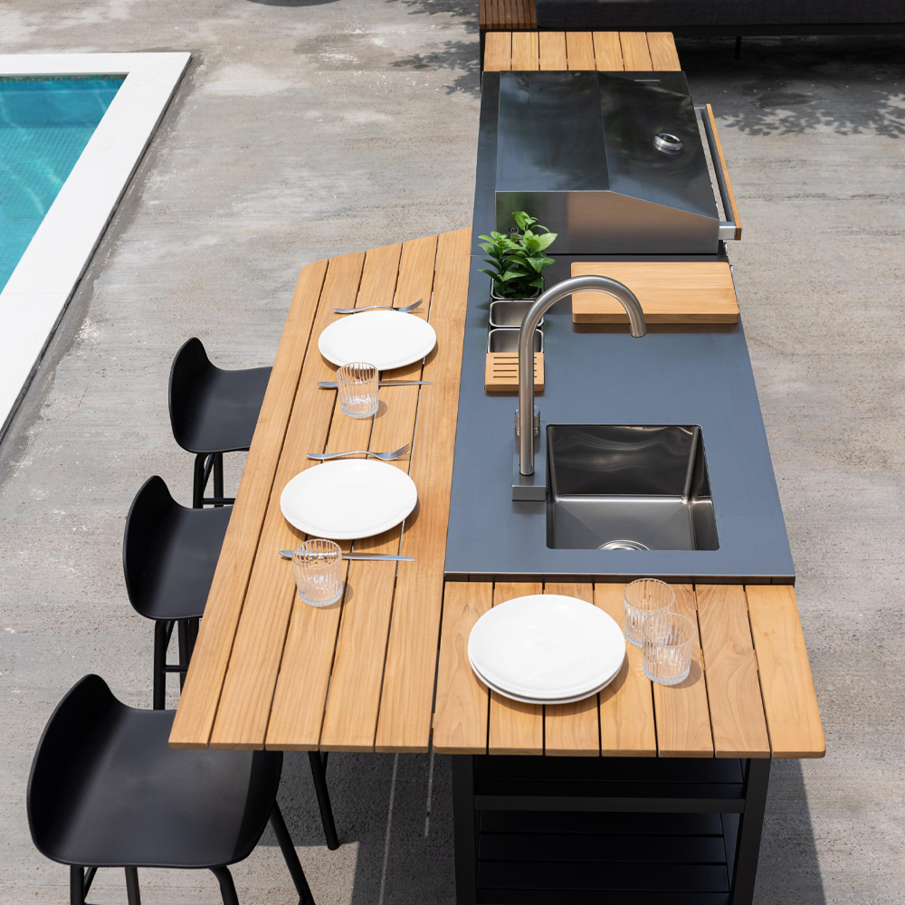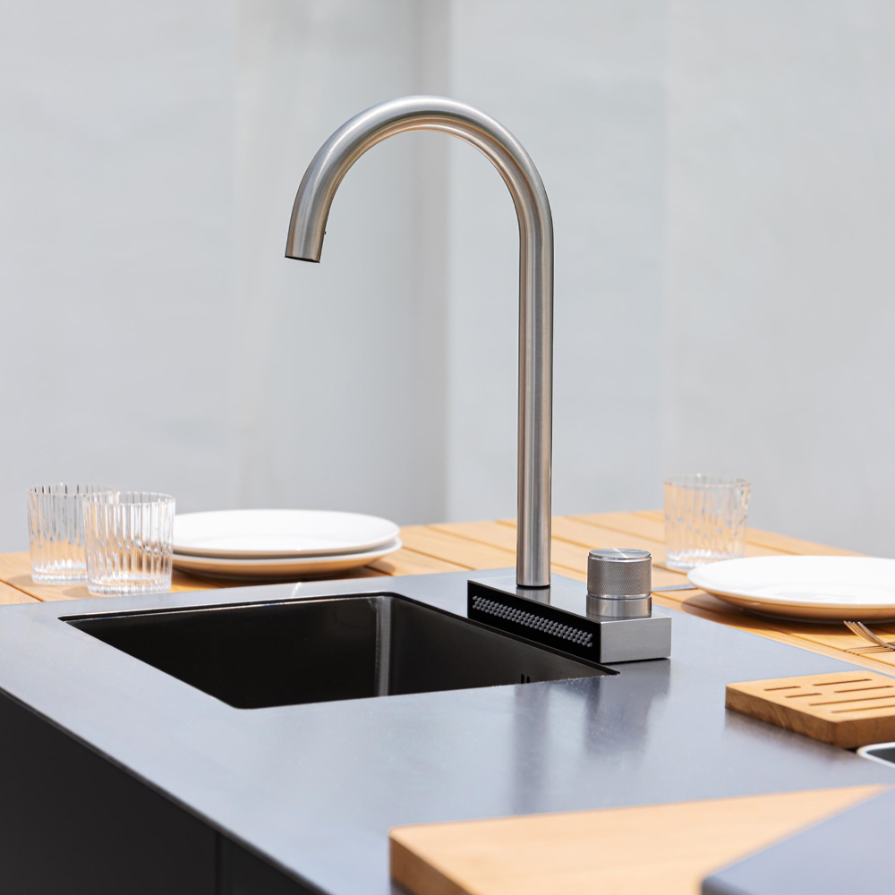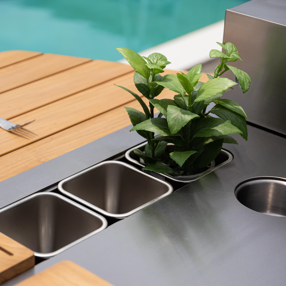 - Für eine gut durchdachte Gartenküche ist die Verfügbarkeit von Wasser unerlässlich. Deshalb wird das Spülenmodul mit einem eingebauten Schnellanschluss für den einfachen Anschluss an den Gartenwasserhahn geliefert