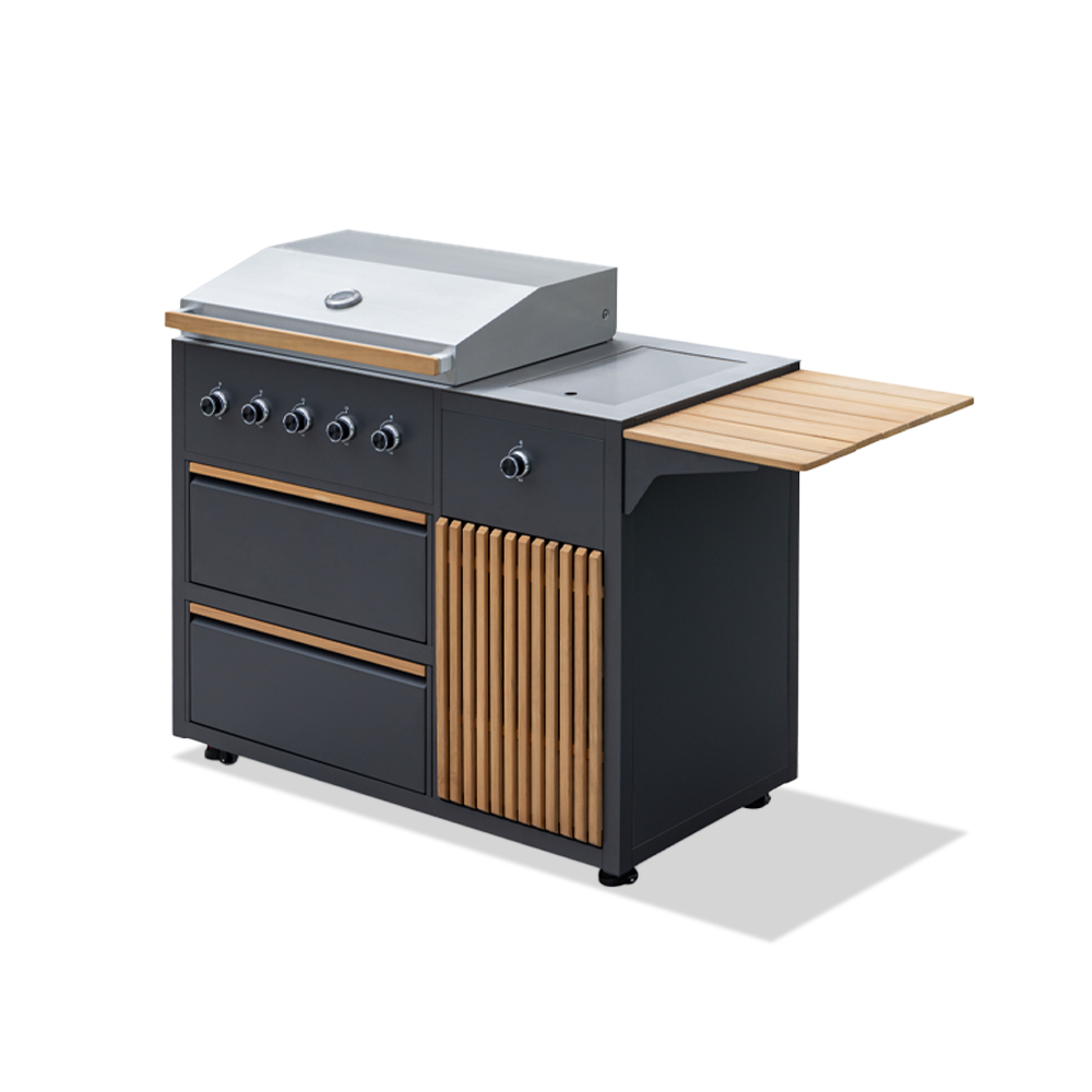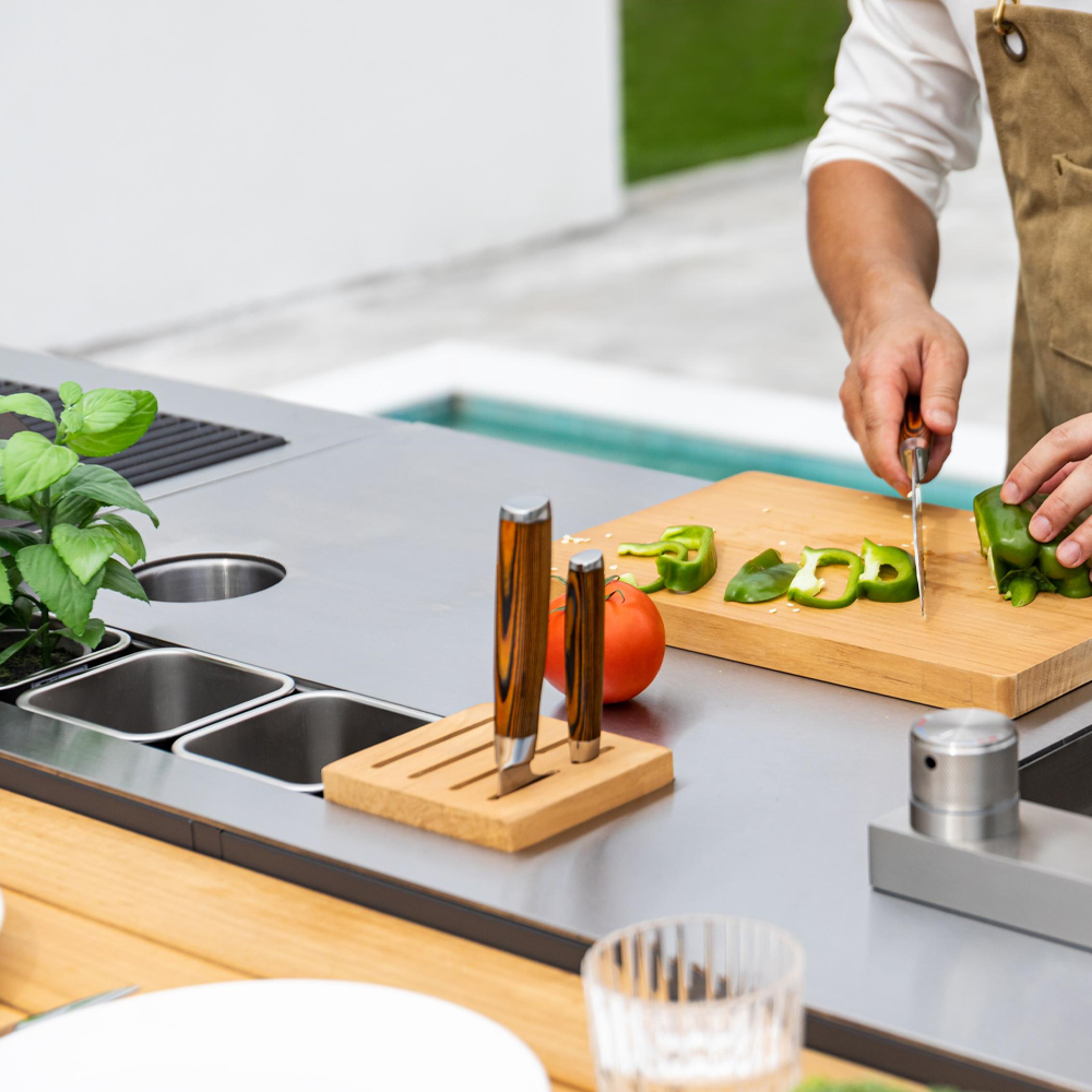 - Chef-Gartenküche mit Elementen, die mit dem praktischen zusätzlichen Outdoor-Küchenmodul kompatibel sind.