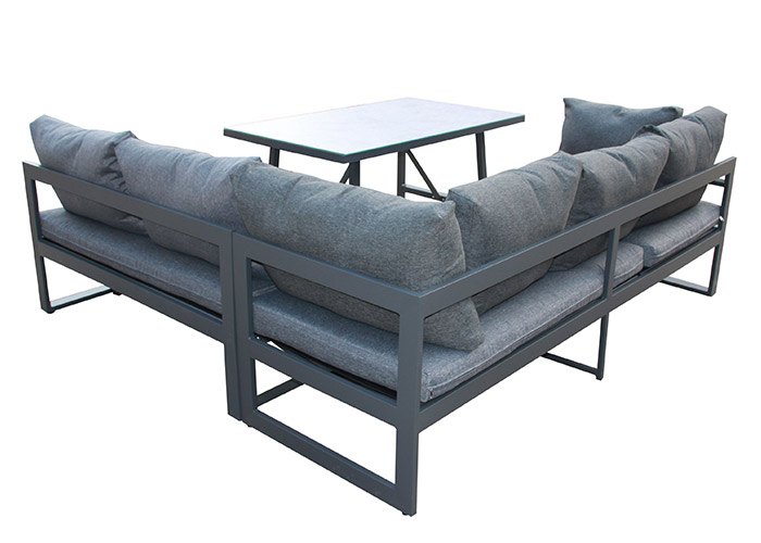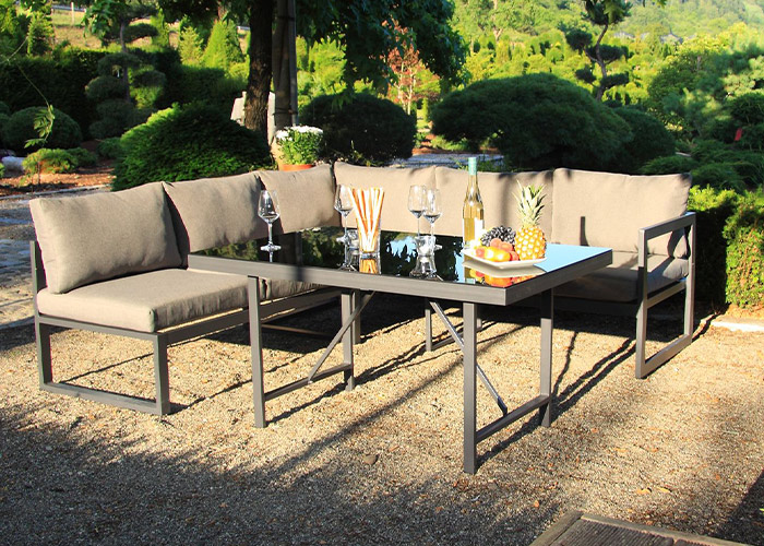 - Eckset mit Aluminiumrahmen mit einer Bank 130 x 70 x 63 cm und einer Bank 214 x 70 x 63 cm