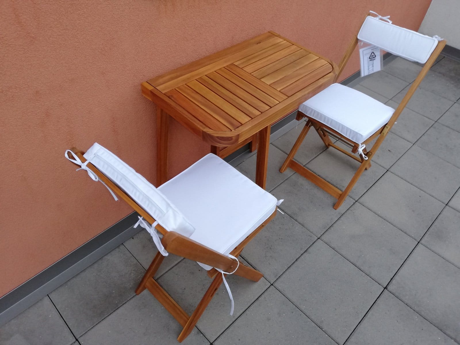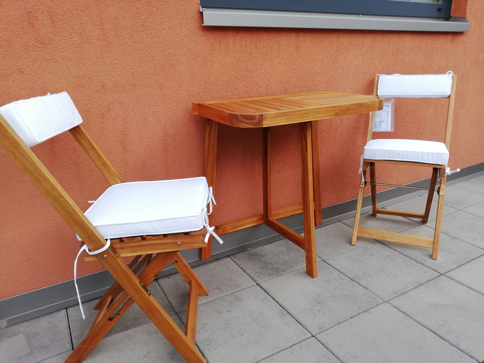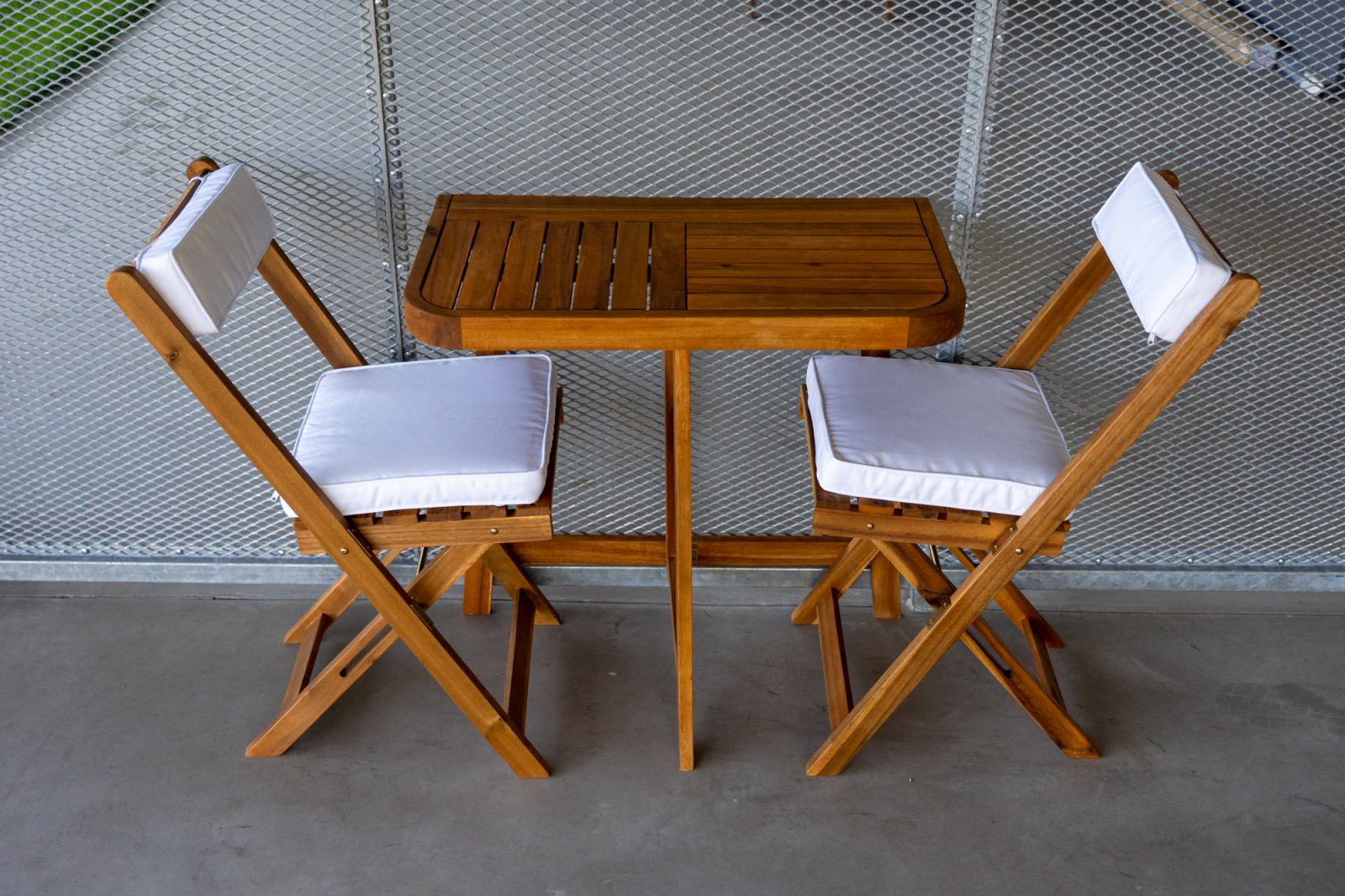 Der klappbare Gartentisch und die klappbaren Gartenstühle lassen sich auf kleinem Raum verstauen und machen kleine Terrassen oder Balkone praktisch.