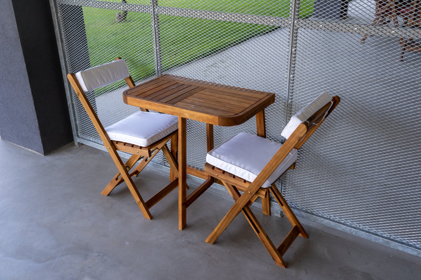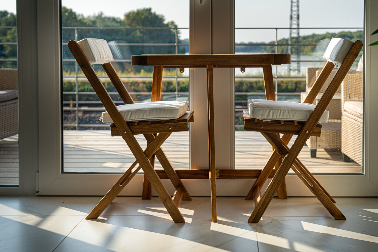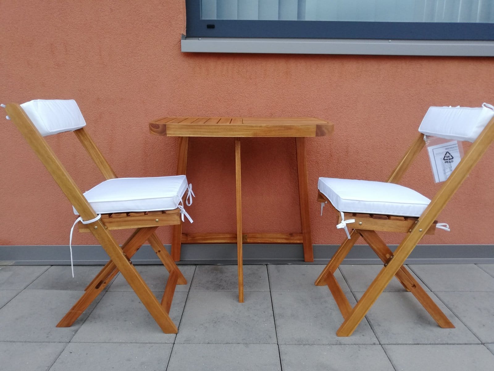 Der klappbare Gartentisch und die klappbaren Gartenstühle lassen sich auf kleinem Raum verstauen und machen kleine Terrassen oder Balkone praktisch.