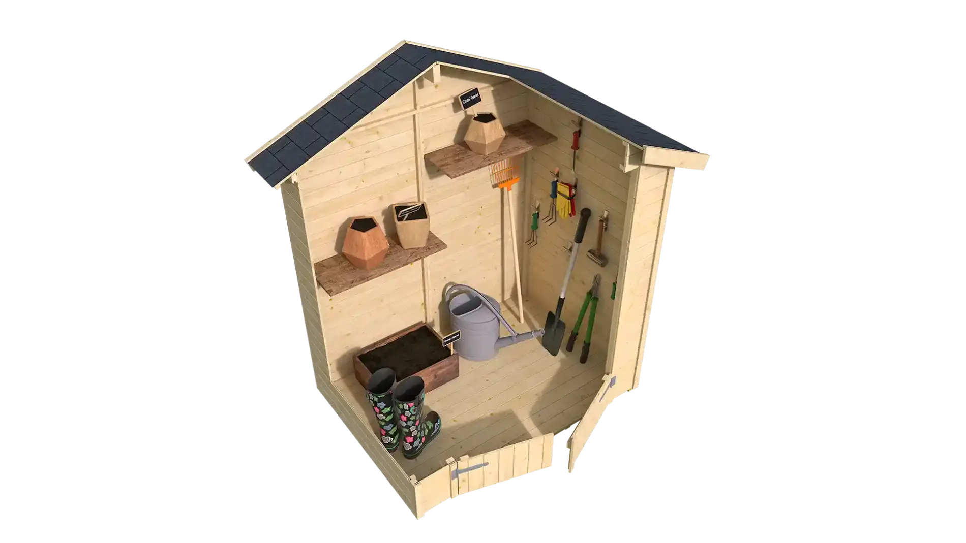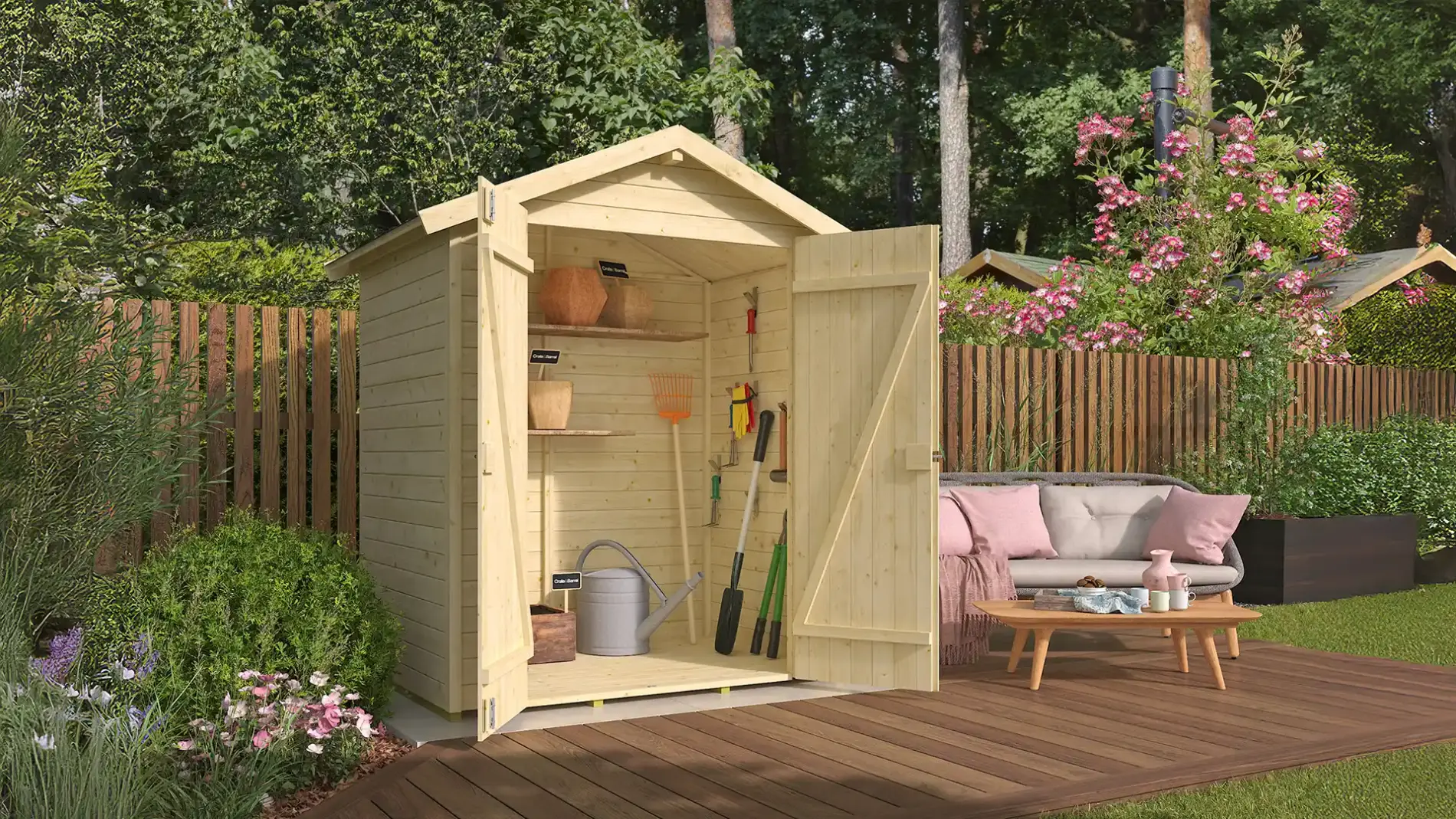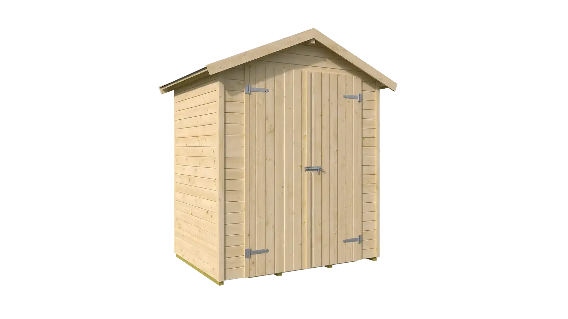 Einfaches, kostengünstiges Gerätehaus aus Holz in Fertigbauweise für eine leichte Montage. 13 mm Seitenwände, inklusive Bodenbelag