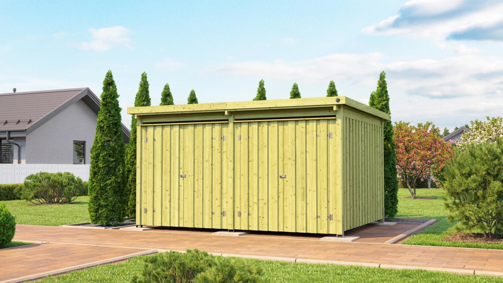 - Gartencontainer mit einer Grundfläche von 288 x 389 cm und einer Gesamtdachfläche von 318 x 408 cm