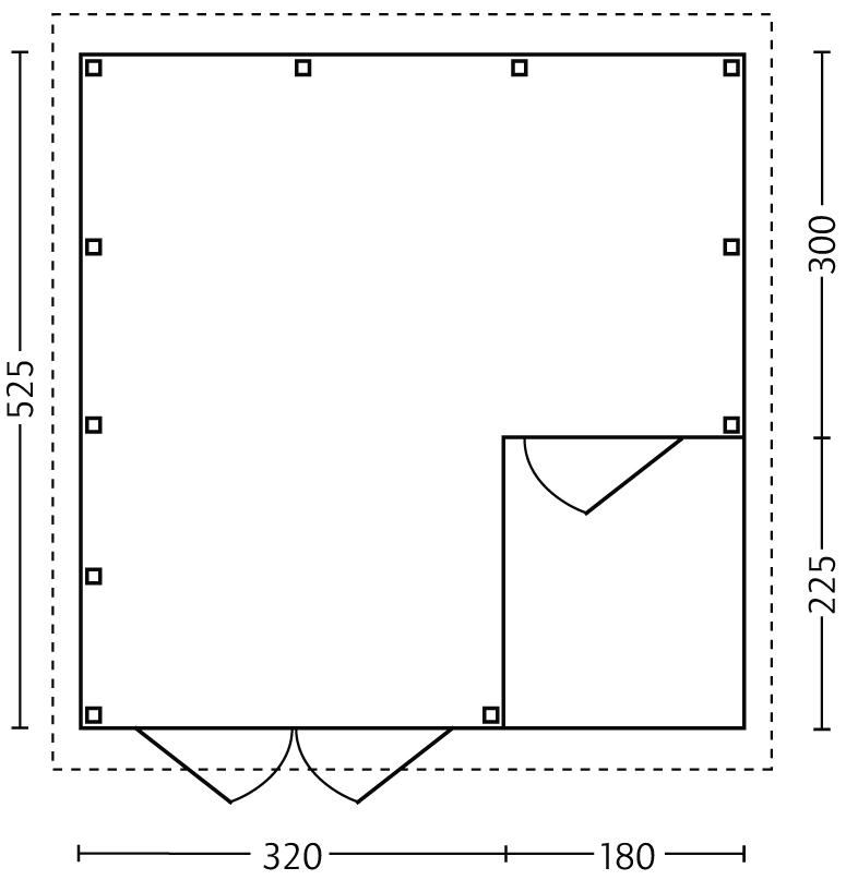 - Geschlossene Garage mit einer Grundfläche von 500 x 525 cm (Einzelkabine mit Gerätehaus)