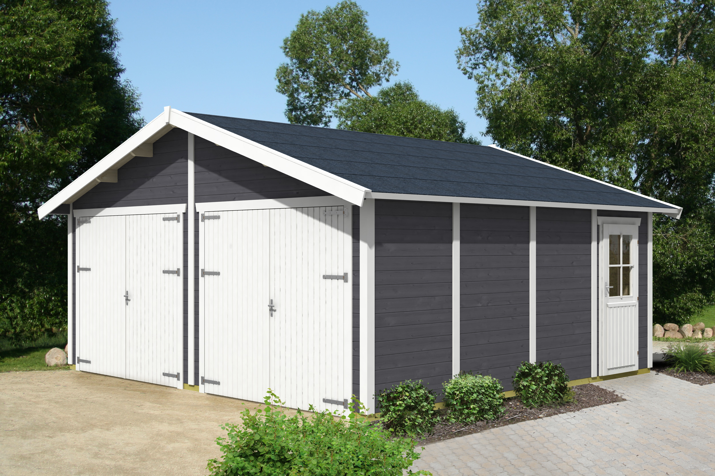 Überdachte, geschlossene Fertiggarage Varberg Größe 3 für 2 Autos