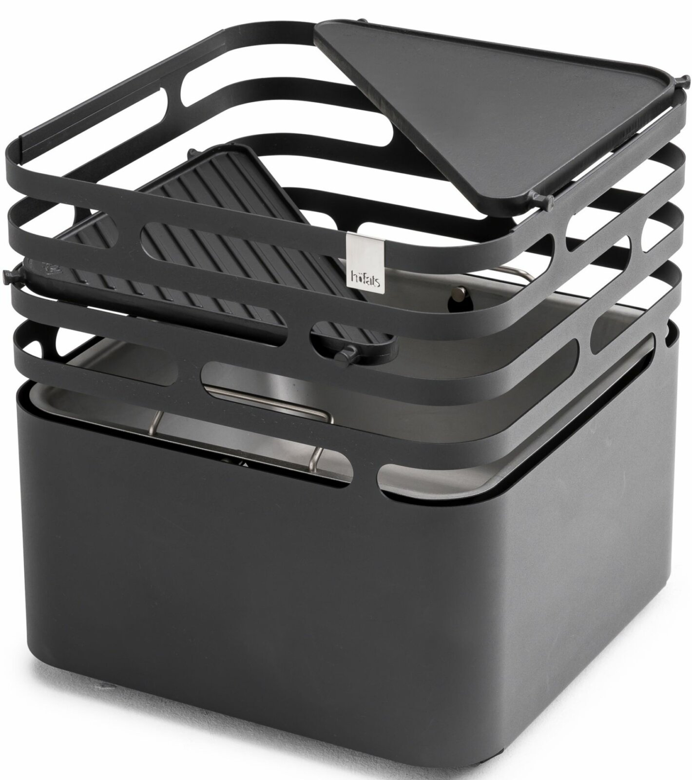 Sie können die gewünschte Grilltemperatur einstellen, indem Sie die Höhe des Gitters der Höfats Cube Grillseitenwand anpassen, d.h. indem Sie die gusseiserne – PLANCHA – Grillplatte näher an das Feuer oder höher von der Glut weg stellen