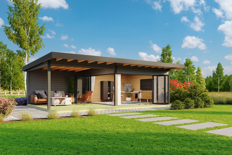 - Vorgefertigter Holzhausbau, Home-Office oder Gartenküchenbau aus vorgefertigtem Holzhausmaterial mit einem riesigen Terrassendach. Ein echtes Schmuckstück im Garten mit diesem vielseitigen Holzhaus.