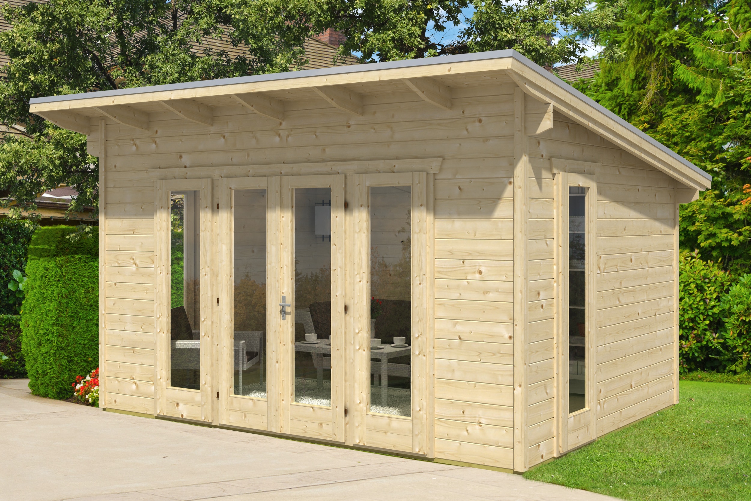 Hochwertiges Skanholz-Design-Holzhaus 350 x 250 cm, 28 mm Wandstärke, 19 mm Bodenbelag und Aluminium-Giebelabschlüsse