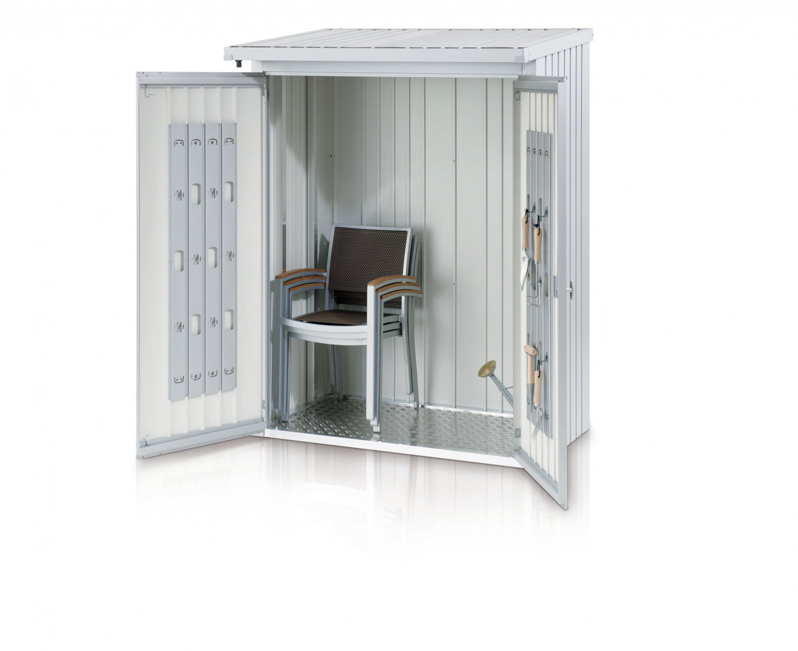 - Hochwertige Materialien: feuerverzinktes und polyamidbeschichtetes Stahlblech, hochwertige Aluminiumrahmen, Schrauben und Scharniere aus Edelstahl