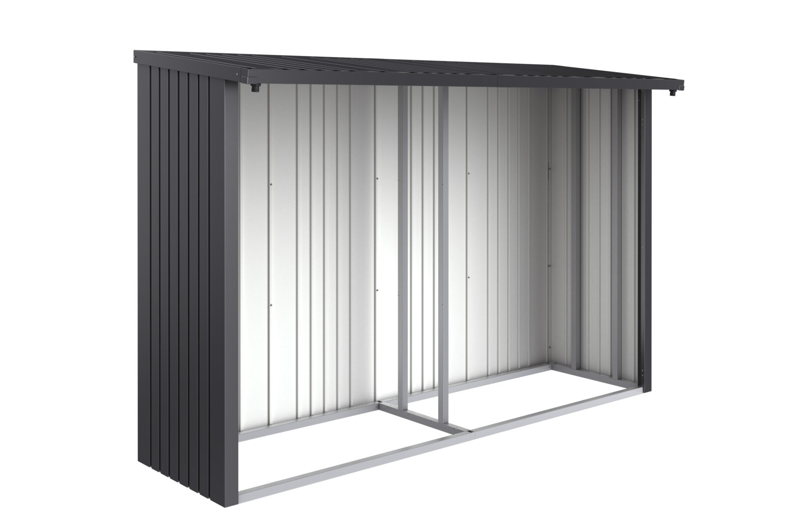 Praktischer, langlebiger Kaminholzspeicher aus Stahl: 157 x 102 cm oder 229 x 102 cm oder 300,7 x 102 cm; Höhe des Holzspeichers 199 cm, erhältlich in 3 Farben; silbermetallic, quarzgraumetallic oder dunkelgraumetallic (Innenfarbe in beiden Fällen grau)