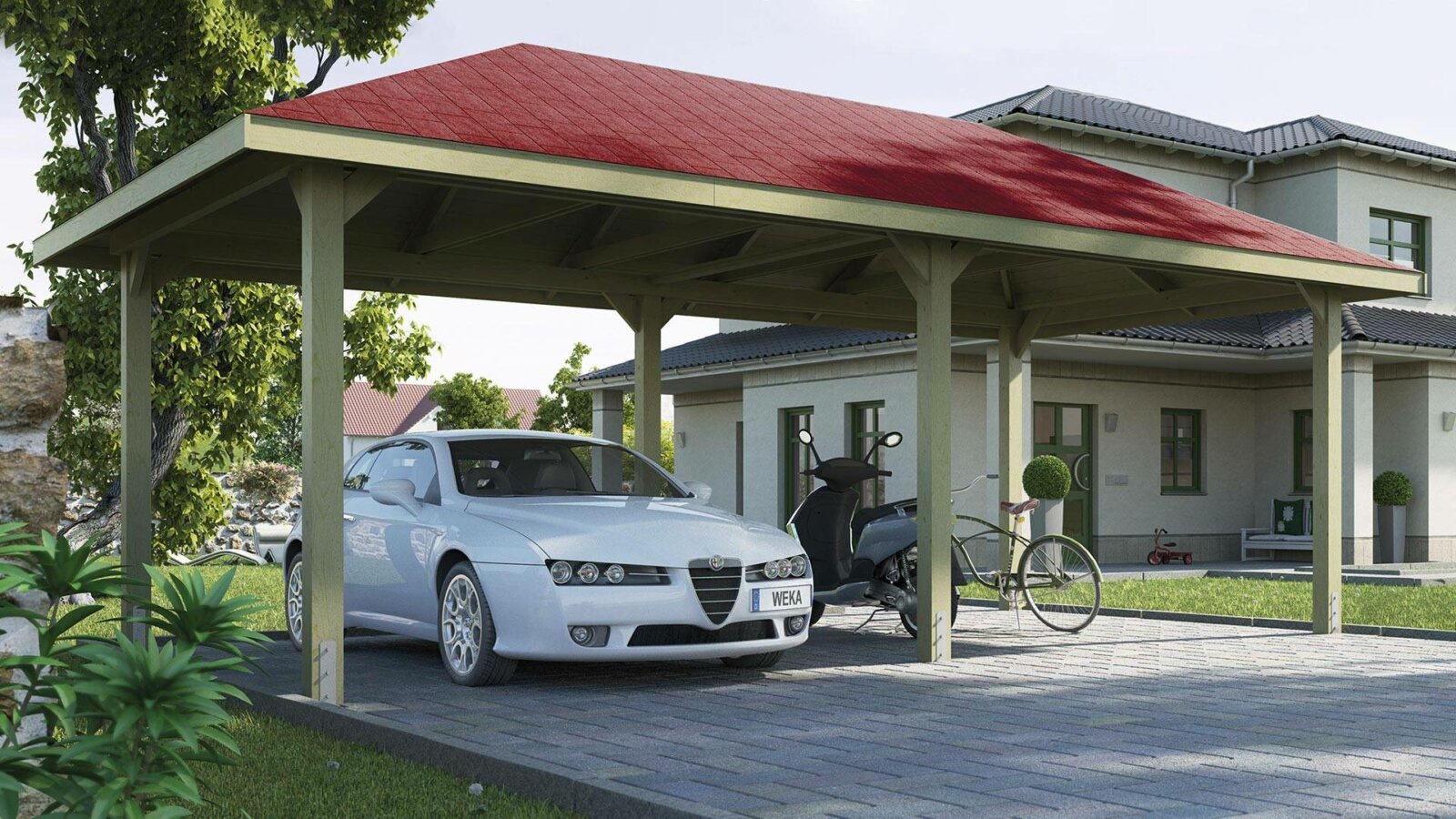 - Der Carport 651 mit modernem Vordach bietet genügend Platz, um Ihr Auto vor dem Wetter zu schützen. Wenn wir diese Pavillon-Garage für Sie bauen können, hat Ihr Auto, Motorrad oder Roller im Winter und im Sommer einen zuverlässigen, geschützten Platz im Garten. Mit nur wenigen Handgriffen verwandeln Sie Ihren Carport in eine Gartenoase, einen schattigen Gartenpavillon im Sommer.