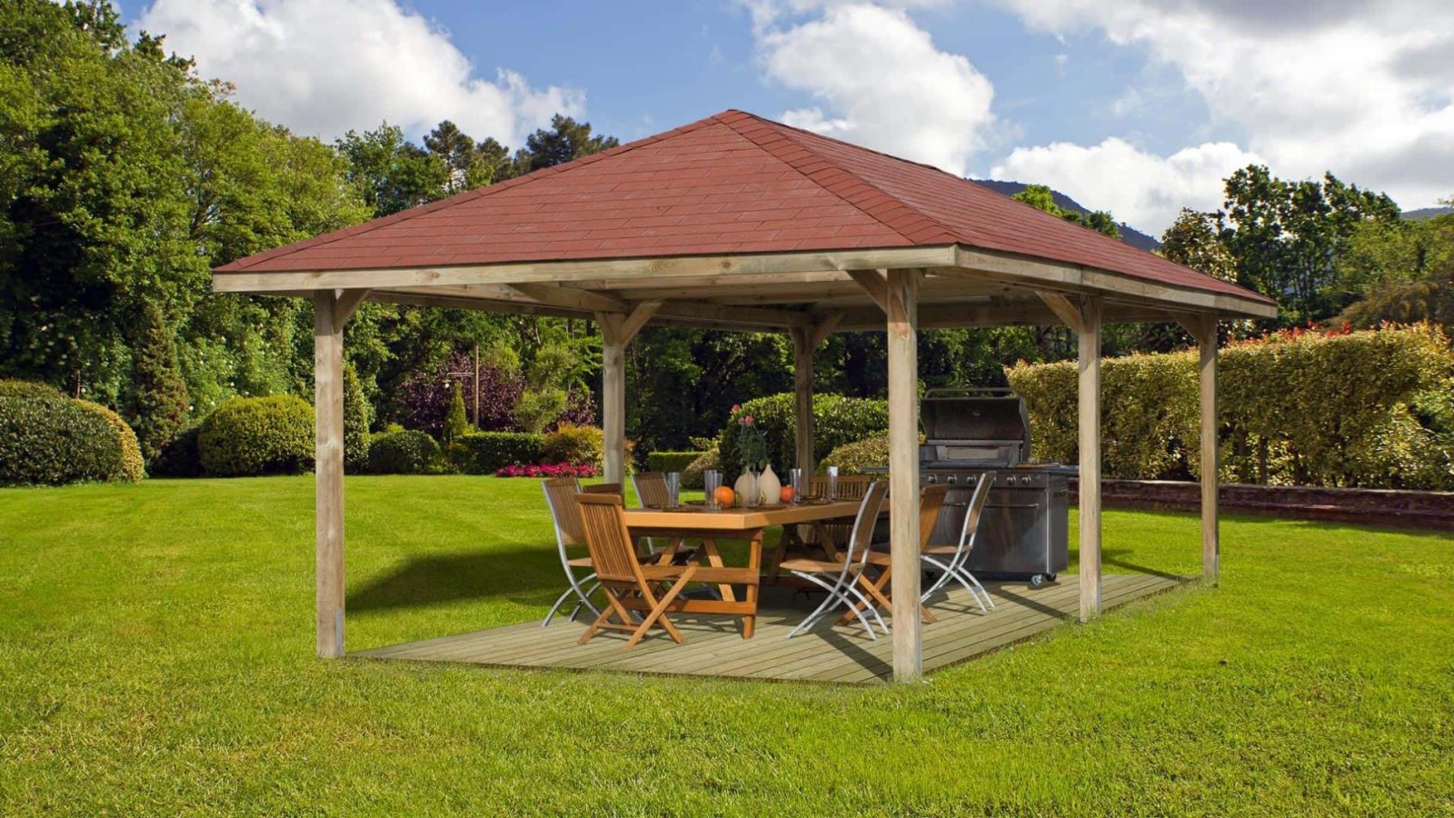 - Unsere vorgefertigte Dachkonstruktion kann auch als Carport-Garage oder als Gartenpavillon für kühlen Schatten in Ihrem Garten dienen.