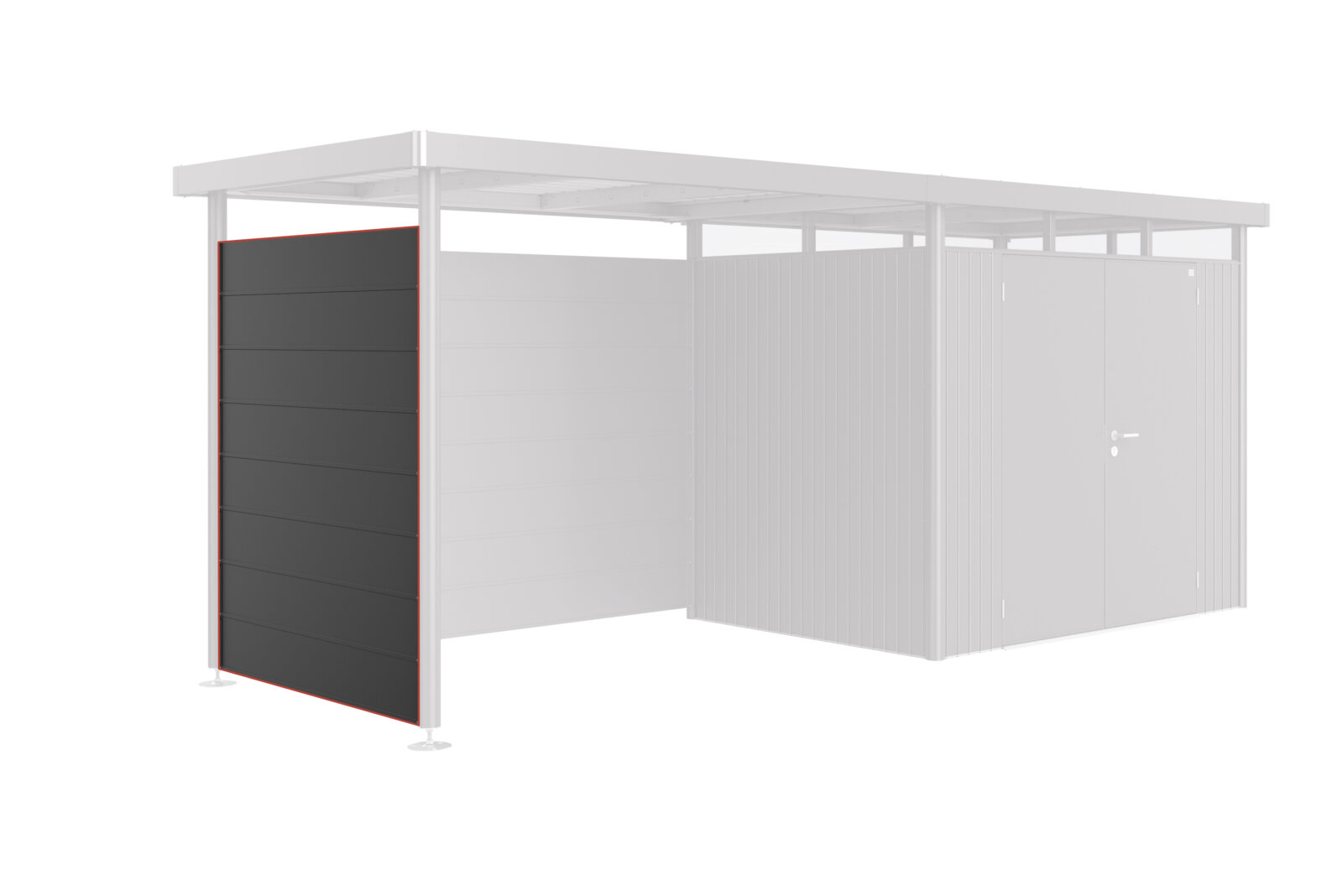 Die Seitentür kann an der linken, rechten oder beiden Seiten des HighLine Stauraums angebracht werden. Das Montageset enthält die Pfosten, ein Regenwasserrohr und das Befestigungsmaterial.