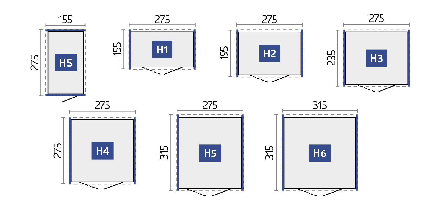 | Méret | H2 (275 x 195 cm), H3 (275 x 235 cm), H4 (275 x 275 cm), H5 (275x315cm) und H6 (315x315cm) |
