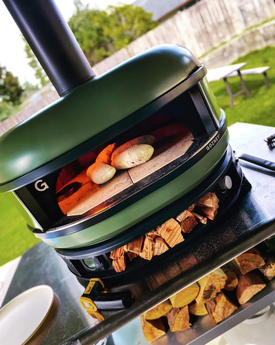 Mit dem Gozney Dome Duo Grillofen können Sie aber auch eine Vielzahl von Speisen bei niedrigeren Temperaturen zubereiten, denn der Gasfluss lässt sich genauso gut steuern wie die Belüftung mit Holz. Lachs, gebackene Kartoffeln, Aufläufe oder gebratenes Gemüse, das auf einer geräucherten Planke zubereitet wird, wird in der trockenen Hitze des Ofens wunderbar knusprig und saftig.