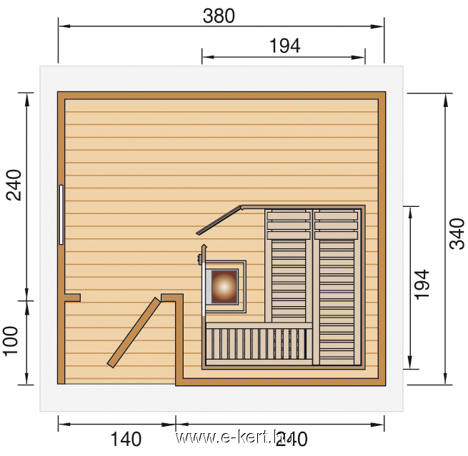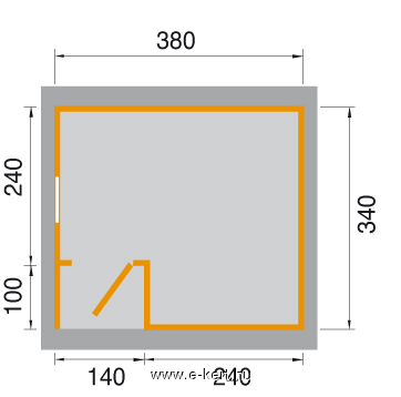 - Größe der Außenecke des Saunahauses (Fundamentgröße) 380 x 340 cm