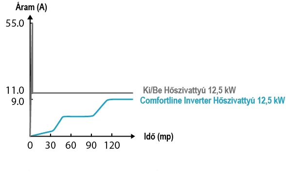 Wenn der Comfortline Inverter-Poolheizer eingeschaltet wird, steigt seine Stromaufnahme von 0 A stetig an, bis er in etwa 2 Minuten die Nennstromaufnahme erreicht. Dadurch wird das Stromnetz Ihres Hauses nicht belastet. Im Gegensatz dazu beträgt die häufige Anlaufstromaufnahme einer Wärmepumpe im Ein/Aus-Modus das Fünffache des Nennstroms, was das Stromnetz belastet.