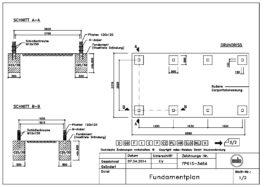 - Die technische Zeichnung für das Fundament finden Sie auf der Registerkarte “Technische Zeichnungen”. Damit können Sie die genauen Verankerungspunkte für die Pfeiler der Stelzen festlegen.