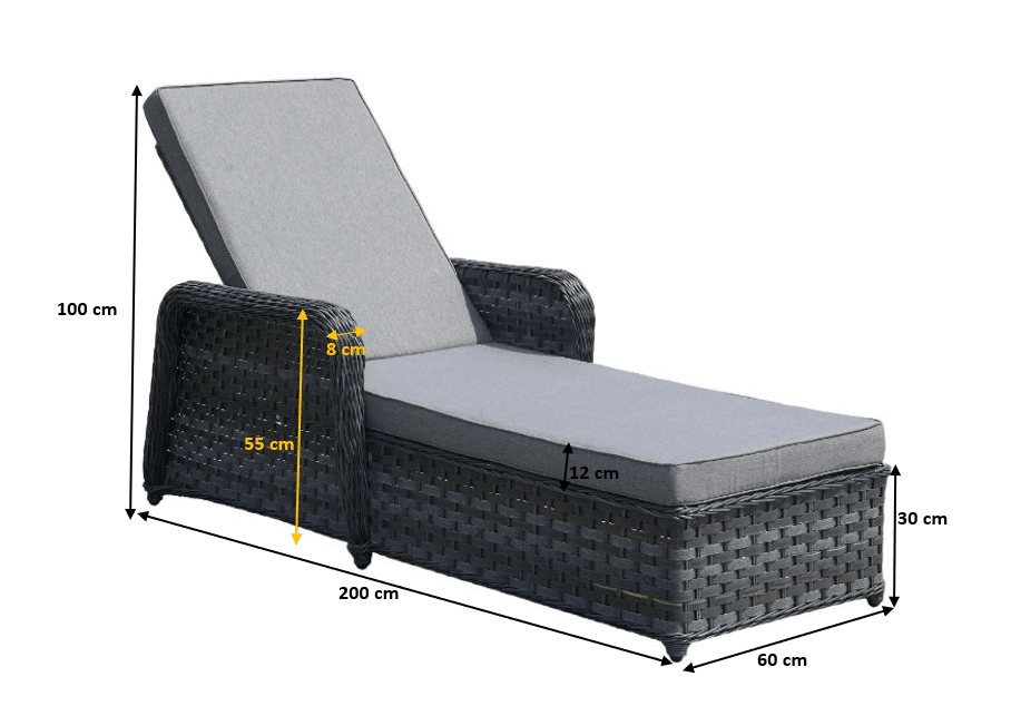 - Größe der Sonnenliege: 200 x 60 cm, Höhe 100 cm; mit eingeklappter Kopfstütze 30 cm