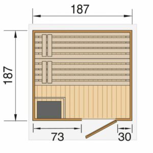 - Die gleiche Saunakabine ist auch in einer größeren Größe von 195 x 195 cm erhältlich, siehe Cubilis Größe 2