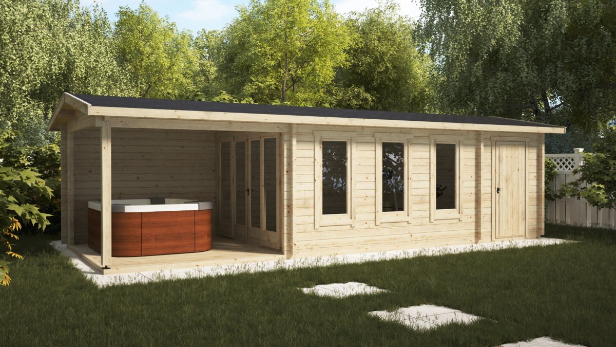 - Außenmaße des Balken-Saunahauses: 390 x 870 cm einschließlich 300 cm Terrasse; Wandstärke des Saunahauses ist 30 mm Massivholzbalken. Die Eckverbindungen sind nicht mit einem Borrahmen versehen, sondern mit Schraubverbindungen mit Rückleisten.