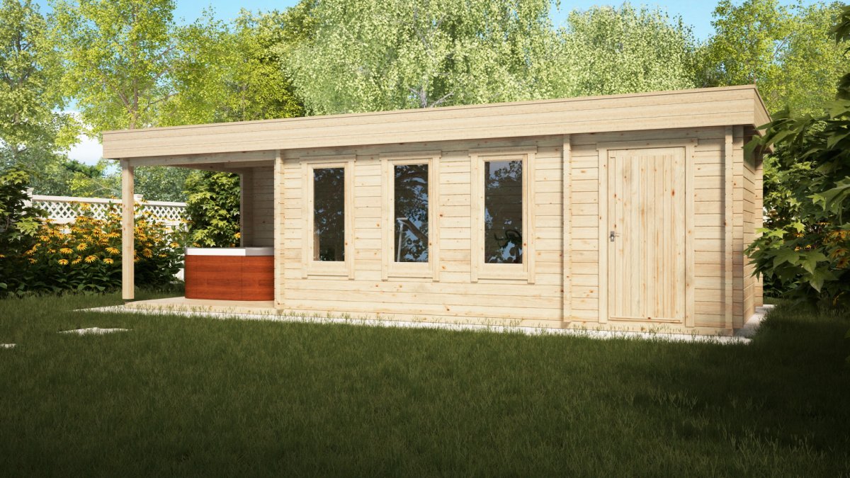Bau eines Saunahauses im modernen Stil 390 x 870 cm mit Terrasse und Gerätehaus