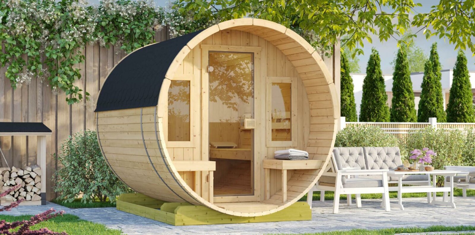 • Gesamthöhe des Fasssaunahauses 217,5 cm
