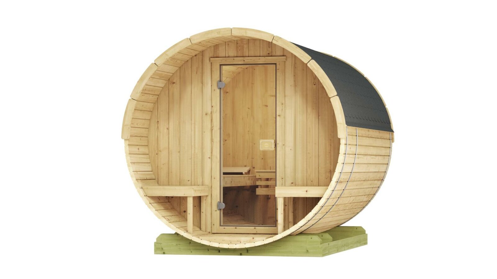Weka Fasssauna Saunahaus Inneneinrichtung: 2 Saunabänke mit 55 cm Breite, Saunaschutzgitter + 2 Kopfstützen sind im Basisangebot enthalten.