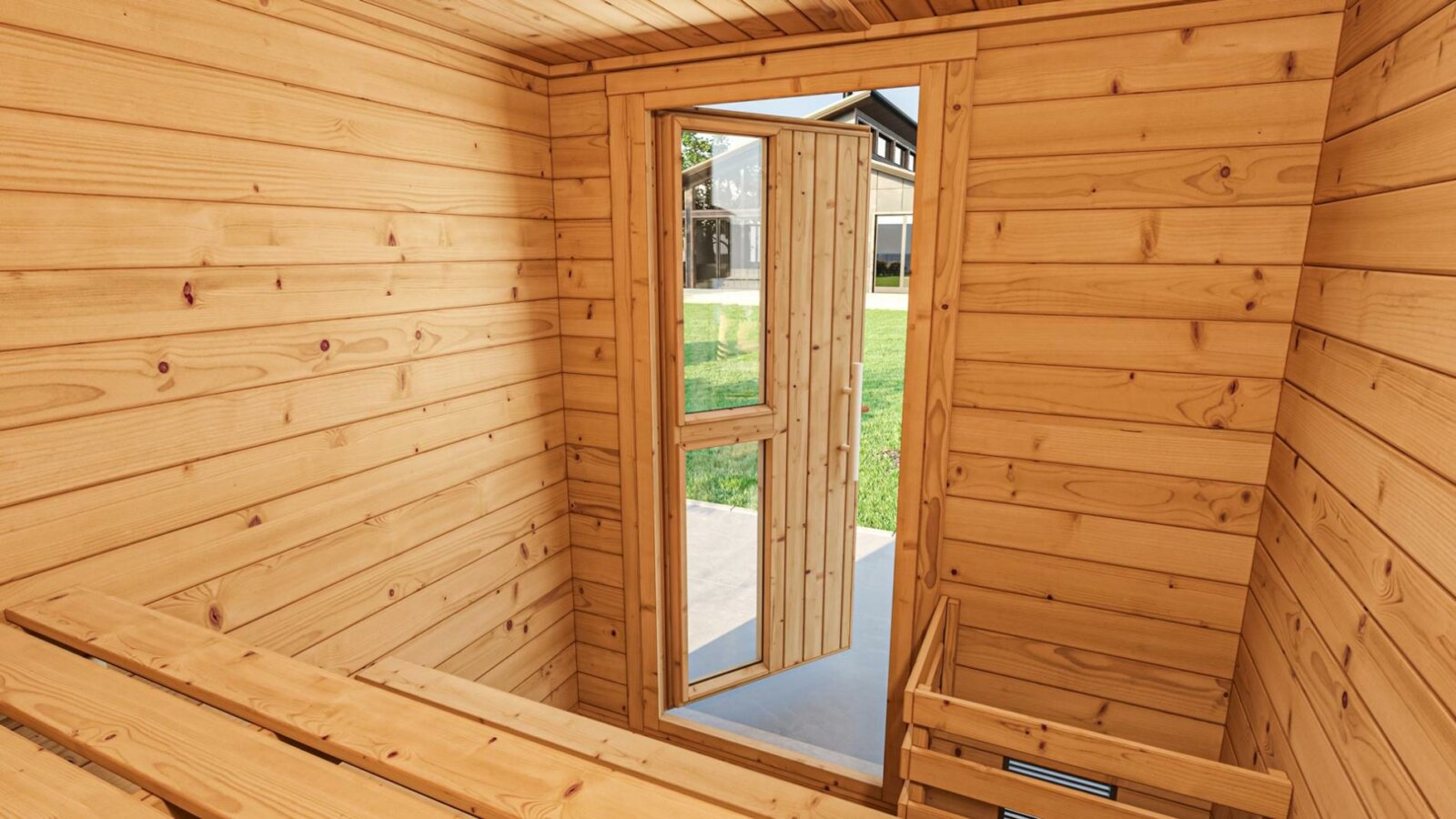 Naantali Saunahaus Innenausstattung: 2 Saunabänke mit 55 cm Breite, Saunaschutzgitter + 2 Kopfstützen sind im Basisangebot enthalten.