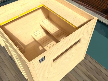 Inneneinrichtung des Saunahauses Kuopio: 2 Saunabänke mit einer Breite von 55 cm, Saunaschutzgitter + herausnehmbares Saunabodengitter 60 x 90 cm + 2 Kopfstützen sind im Basisangebot enthalten.