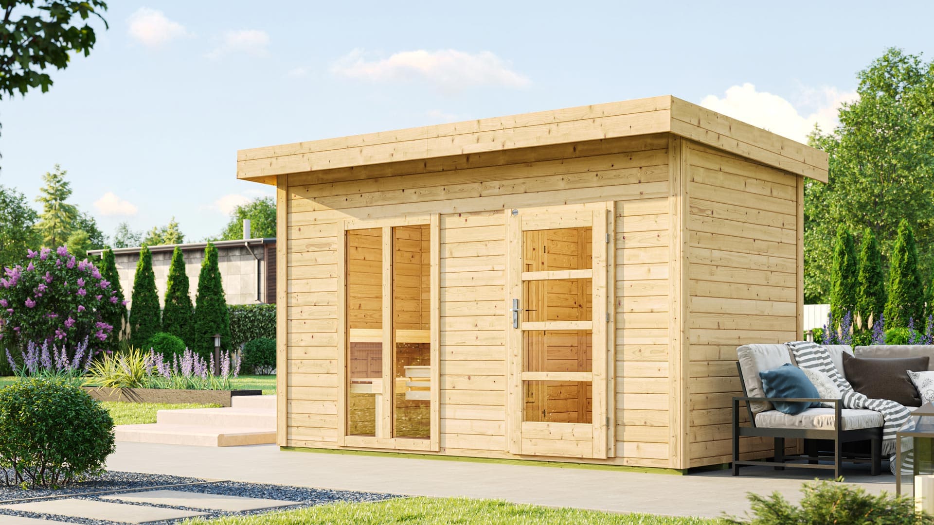 - Für eine optionale Terrasse für das Saunahaus, fragen Sie bitte nach einem individuellen Angebot.