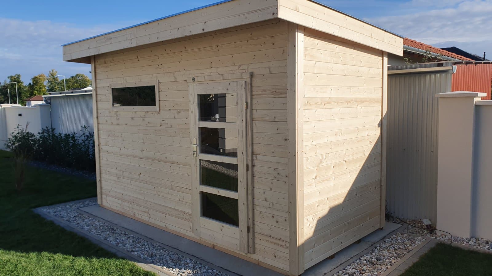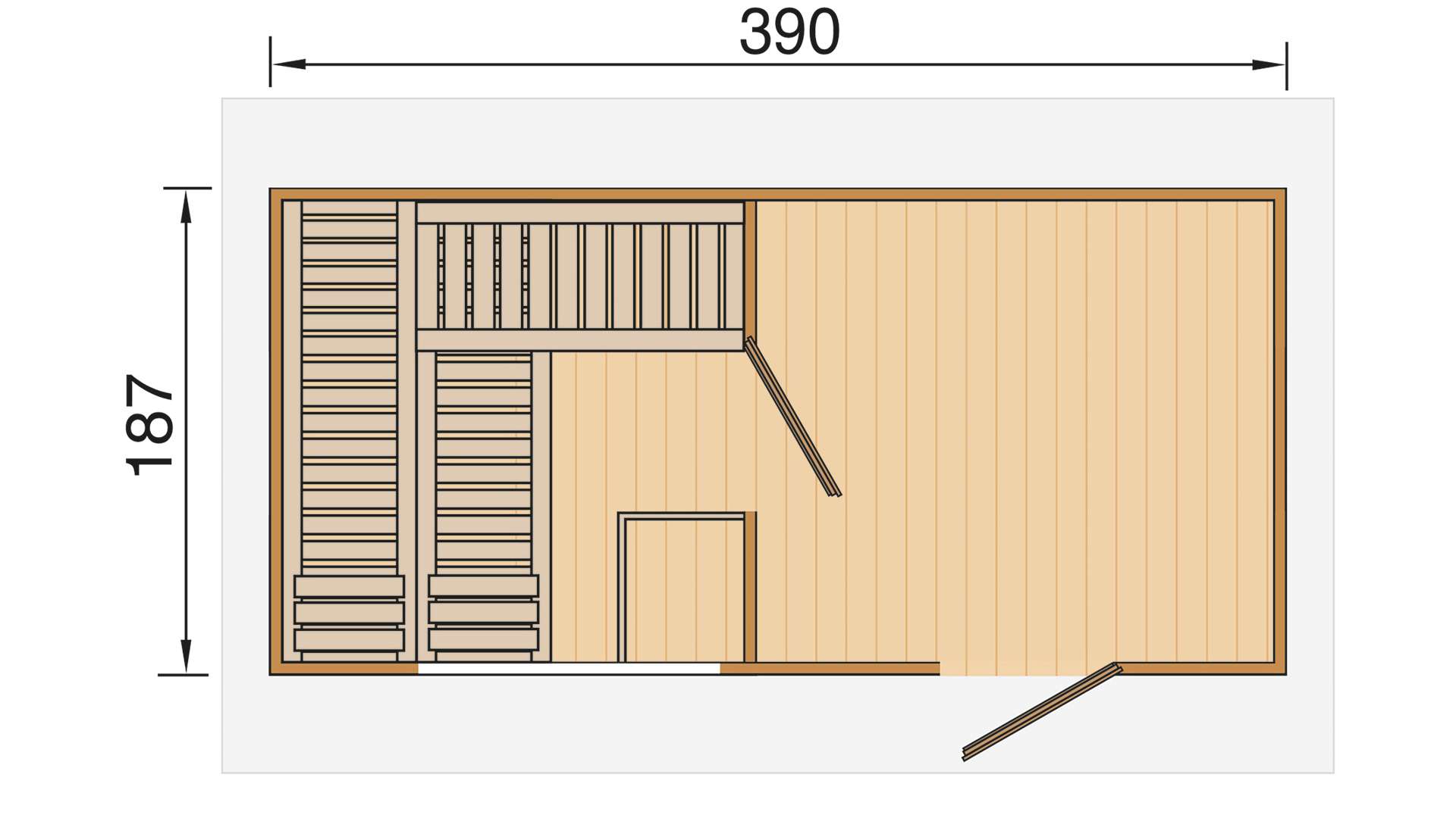 - Das 390 x 187 cm große Saunahaus wird eine 179 x 190 cm große finnische Sauna beherbergen.