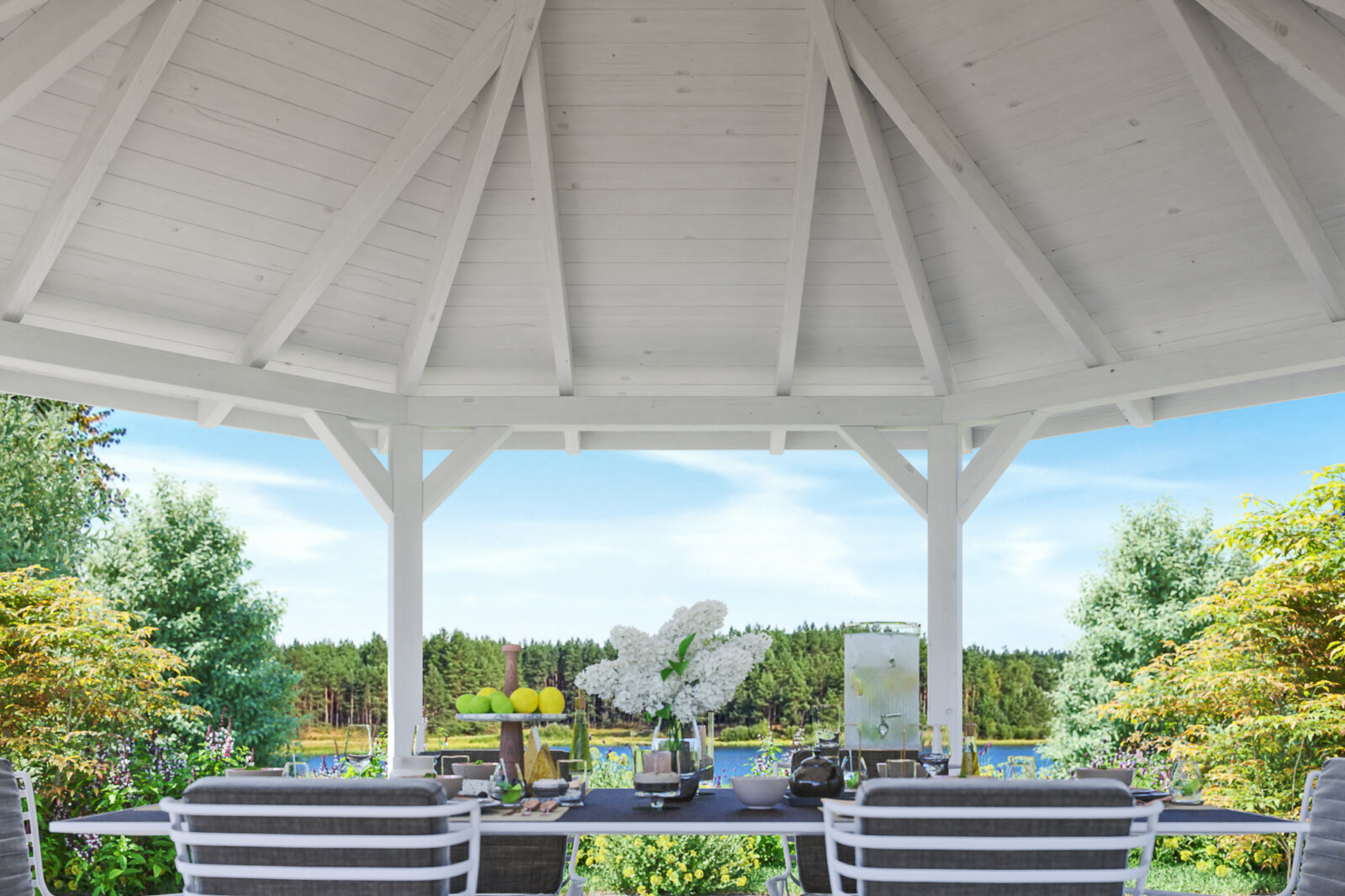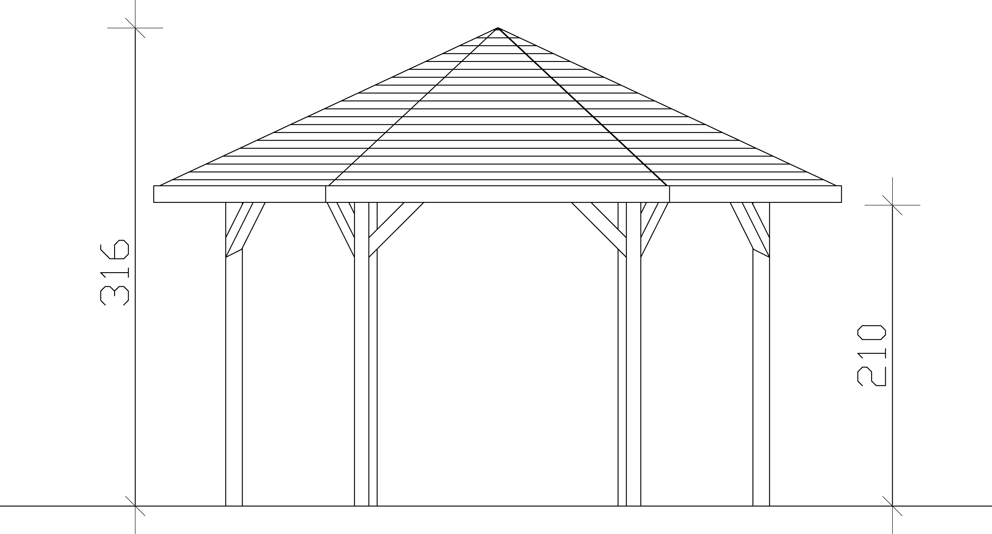 - Maße des Pavillonsockels: 249/360 cm oder 309/420 cm oder 369 /480 cm (Diagonale der Säulen / gesamte Dachdiagonale)